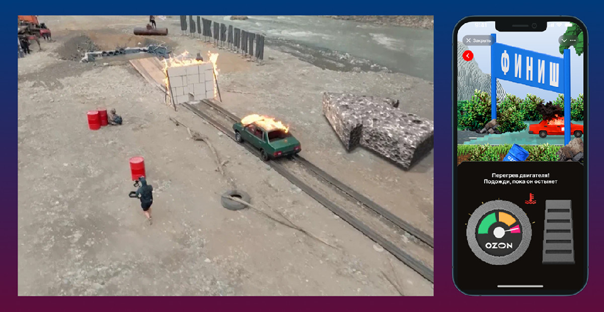 Мини-игра «Горящий автомобиль». Это испытание повторяло трюк из шоу: участники должны были проехать на пылающей машине сквозь стену и упасть в водоем, чтобы потушить огонь. В игре нужно было тапать по экрану, чтобы разогнаться до максимальной скорости, при этом следить за температурой двигателя.