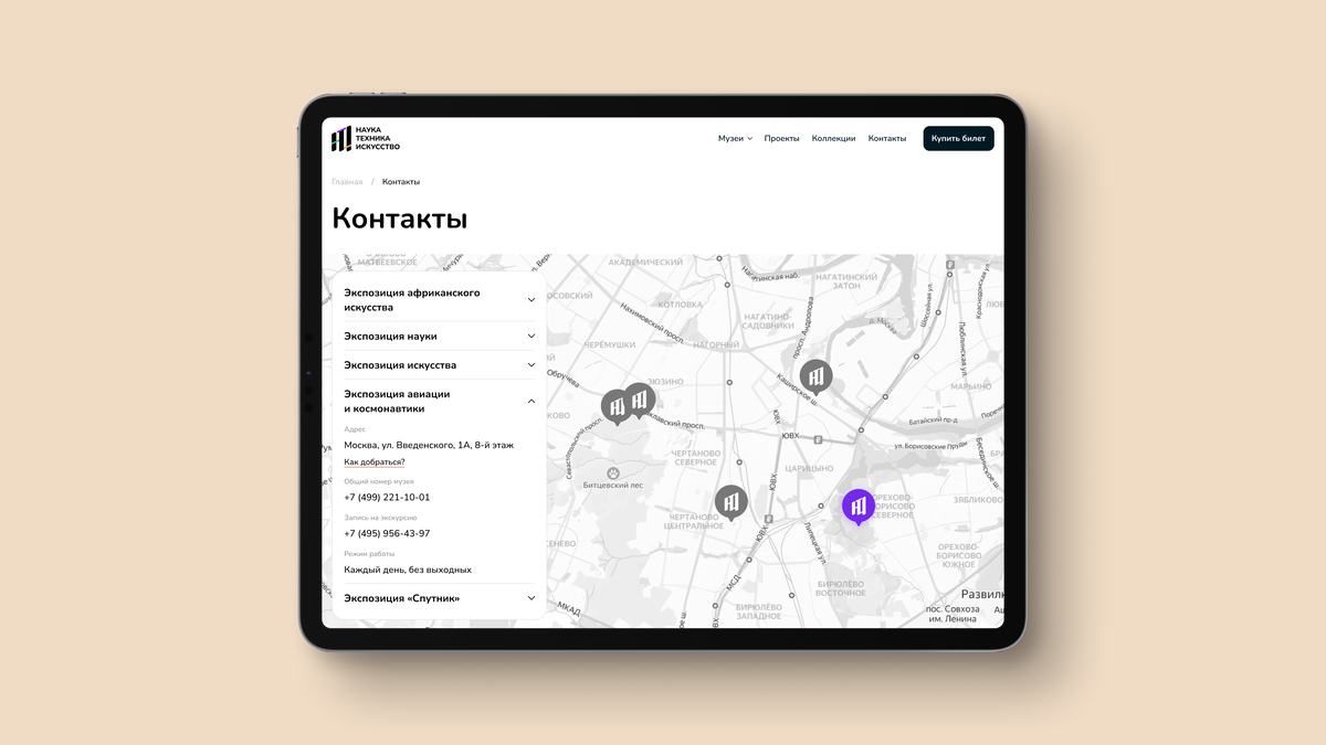 На странице собраны все адреса филиалов музея. Это позволяет пользователям быстро найти нужное место и получить всю необходимую контактную информацию.