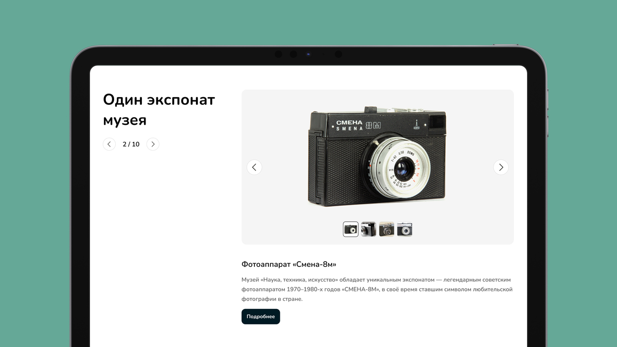Этот блок предназначен для выделения и детального представления отдельных экспонатов музея. Его задача — привлечь внимание посетителей к интересным и значимым объектам коллекции. В блоке размещены изображения экспоната, его описание, а также история или культурное значение, которое помогает пользователю глубже понять важность объекта.