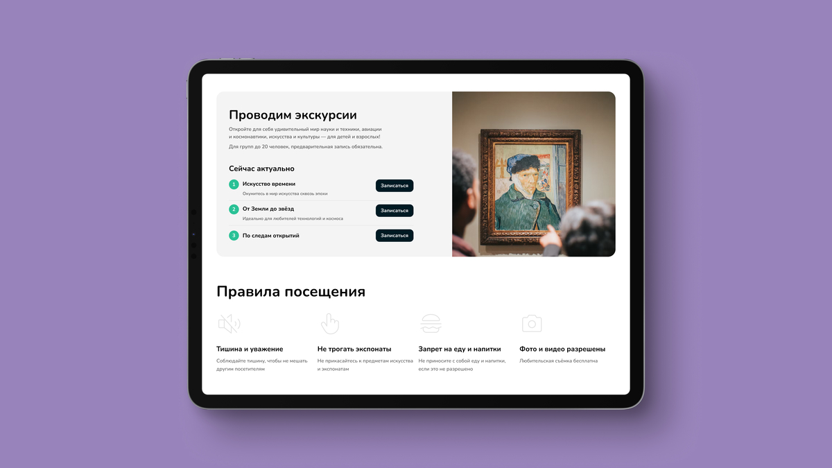 Главная страница помогает быстро найти нужную информацию. Все разделы чётко структурированы — это позволяет посетителям легче искать нужную информацию. На главной странице также реализованы важные функции, такие как онлайн-запись на экскурсии, покупка билетов и просмотр детализированных страниц экспонатов. Адаптивный дизайн сайта обеспечивает комфортный просмотр на любых устройствах.