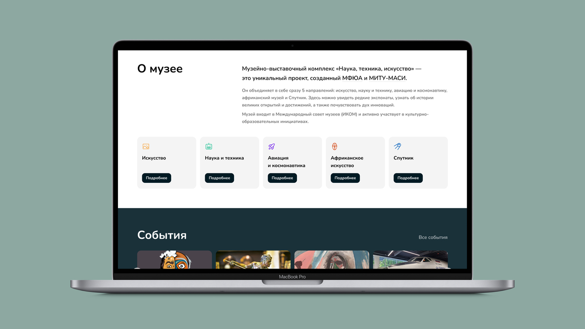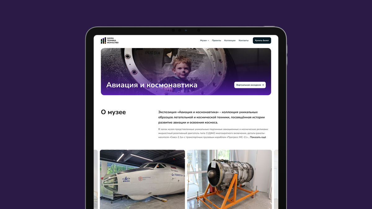 Страница музея включает информацию о каждом направлении экспозиции. Каждый раздел рассказывает о текущих выставках, лекциях и событиях, а также о коллекциях, связанных с темой музея. Например, раздел «Авиация и космонавтика» демонстрирует уникальные экспонаты, такие как реактивные двигатели, а «Искусство» — картины и скульптуры. Кроме того, на странице есть информация о предстоящих событиях, таких как лекции и экскурсии, с возможностью заранее записаться на участие в туре.