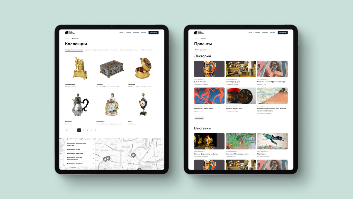 Раздел «Коллекции» даёт пользователям возможность познакомиться с уникальными экспонатами музея. Каждый объект сопровождается изображением и коротким описанием, что позволяет не просто увидеть предметы, но и узнать их историю и значимость. Раздел «Проекты» включает две основные категории: «Лектории» и «Выставки». В нем собраны как текущие, так и прошедшие проекты музея. Пользователи могут легко ознакомиться с каждым проектом и его деталями. Интерфейс позволяет фильтровать проекты по месту проведения, упрощая поиск информации.