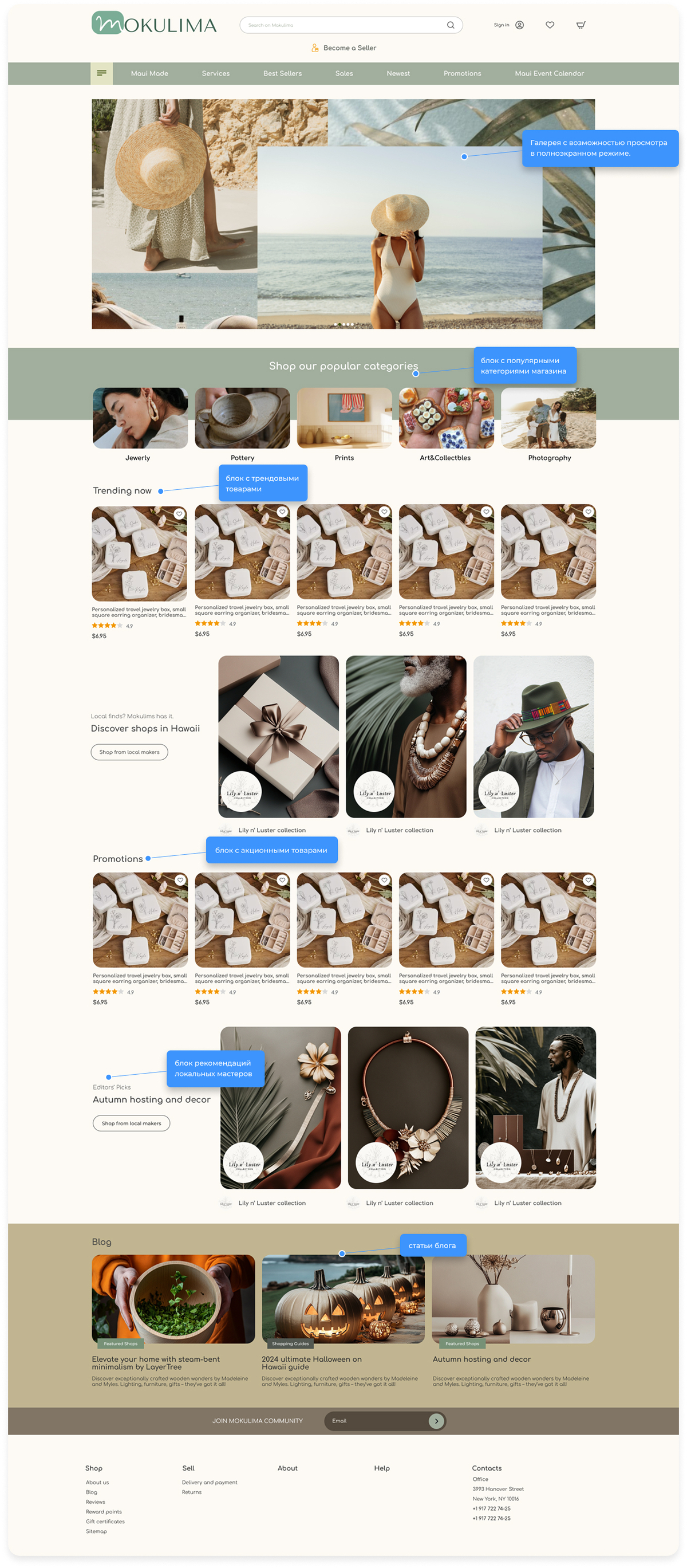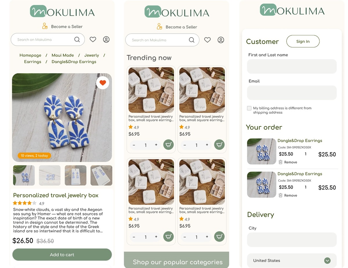 Это позволило нам максимально конкретизировать цели и задачи проекта. Мы также опирались на собственный опыт разработки дизайна сайтов ювелирных украшений. В качестве референса клиент выбрал маркетплейс Etsy. Нашей задачей было создать аналогичный по стилю маркетплейс, локализованный для Гавайев, который передавал бы курортную атмосферу и местный колорит. В работе мы сделали упор на анализ потребительского пути (Customer Journey), юзабилити, тщательную проработку мобильной версии и сильный визуальный дизайн.