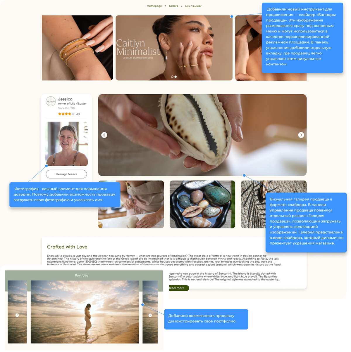 3. Визуальная галерея продавца в формате слайдера. В панели управления продавца появился отдельный раздел «Галерея продавца», позволяющий загружать и управлять коллекцией изображений. Галерея представлена в виде слайдера, который динамично презентует украшения магазина.