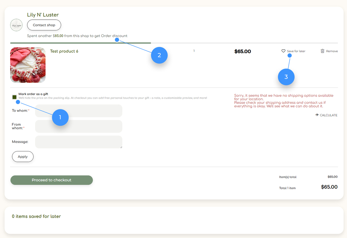 2. Реализовали функцию, которая позволяет сообщить продавцу, что заказ является подарком. Нужно лишь отметить галочку «Отметить заказ как подарок» в корзине. После этого откроются поля для персонального поздравления: «Кому», «От кого», «Добавить сообщение». Вся эта информация будет отображаться в заказе. Также, заказы, отмеченные как подарки, автоматически получают специальную метку «Подарочная упаковка» в общем списке, что позволяет легко находить их среди других заказов.