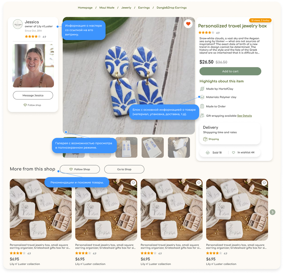 За основу мы взяли примерный макет страницы товара, предоставленный клиентом. Кроме того, мы сохранили цвета и стиль старого дизайна, поскольку они соответствовали тематике маркетплейса handmade-товаров. Сделали акцент на детализации и истории продукта: