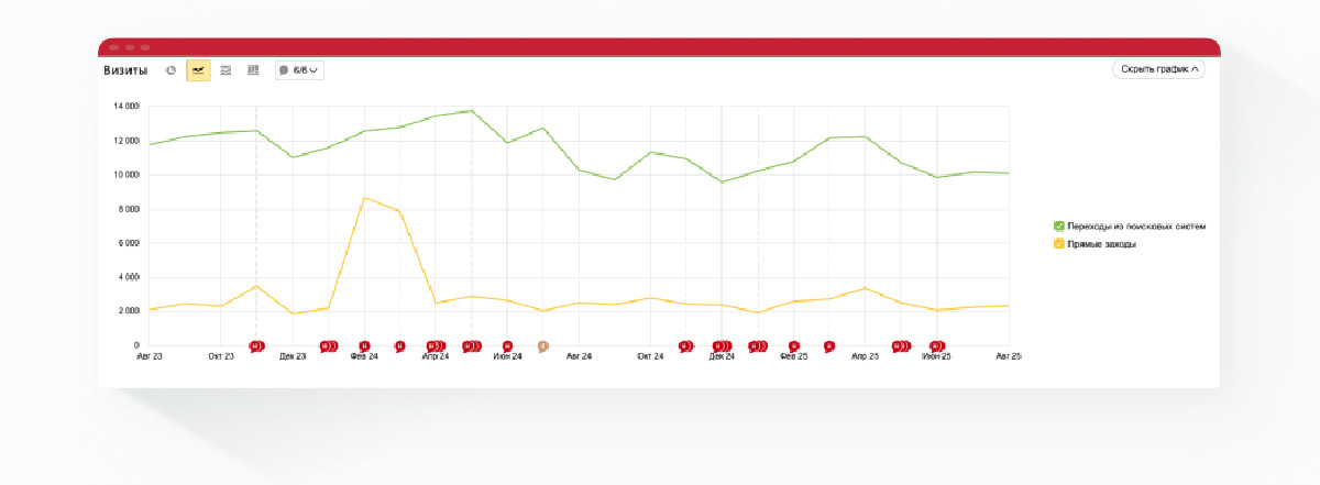 По данным Яндекс.Метрики, в 2025 году удалось выйти на стабильный результат: март–апрель 2025 (сезонный пик) – 12 200+ визитов из поиска. Даже в «низкий сезон» (лето 2025) сайт удержал планку около 10 000 визитов, что выше уровня 2023 года. Прямые заходы выросли с ~2 000 в месяц (осень 2023) до 3 300+ в пиковый сезон 2025.