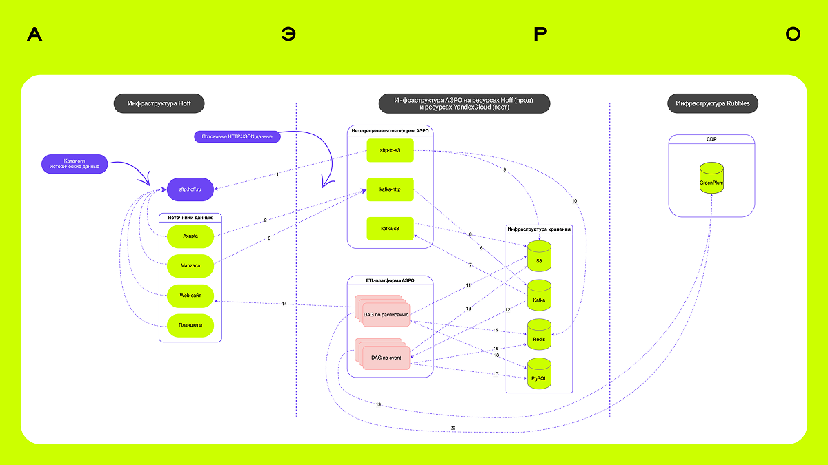 На следующем этапе мы определили, какие данные нужны для каждого бизнес-сценария, в каких системах они находятся — и на основе этой информации разработали архитектуру, связывающую эти системы с платформой Rubbles. Основным источником данных была Axapta — именно там хранились заказы и чеки. Мы выстроили асинхронную архитектуру на Kafka и написали адаптер, который подстраивался под уже существующий поток данных между Axapta и Exponea. Axapta по нашему запросу переключила этот поток на Rubbles. Данные из Axapta и других систем шли в систему Kafka, которая с помощью Kafka Consumer загружала их в S3. Уже оттуда Airflow разбирал файлы по расписанию и загружал их в стейдж-зону Rubbles на базе Greenplum.