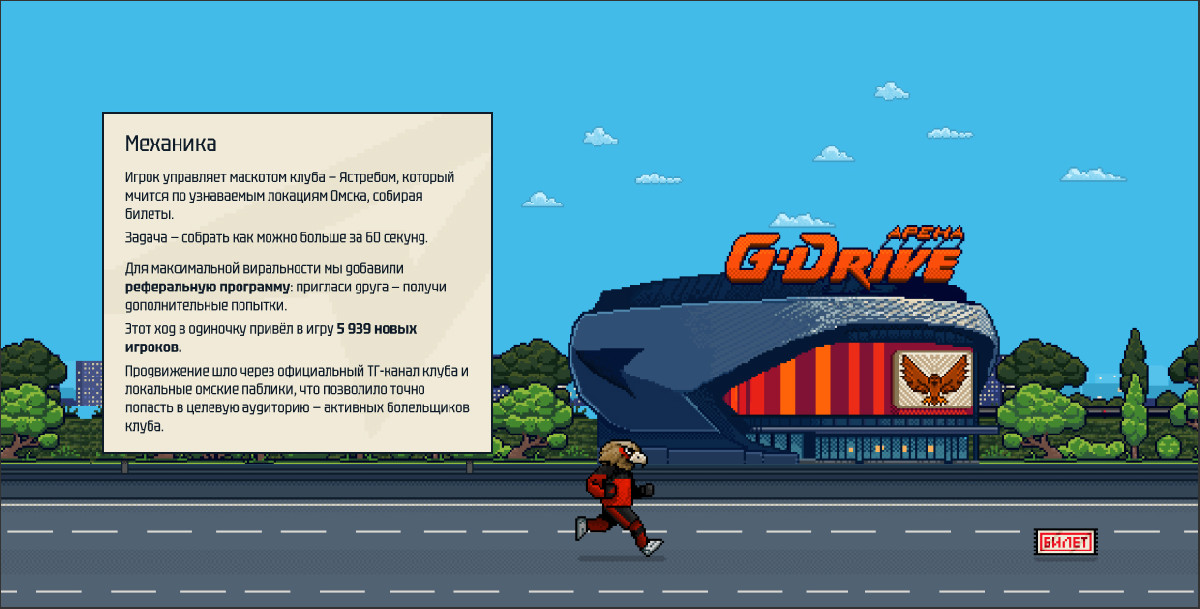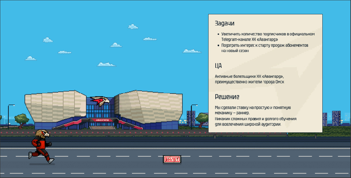 Мы предложили отказаться от стандартных рекламных механик в пользу геймификации. Нашим решением стал запуск уникальной игры-раннера в стиле пиксель-арт, интегрированной в Телеграм.