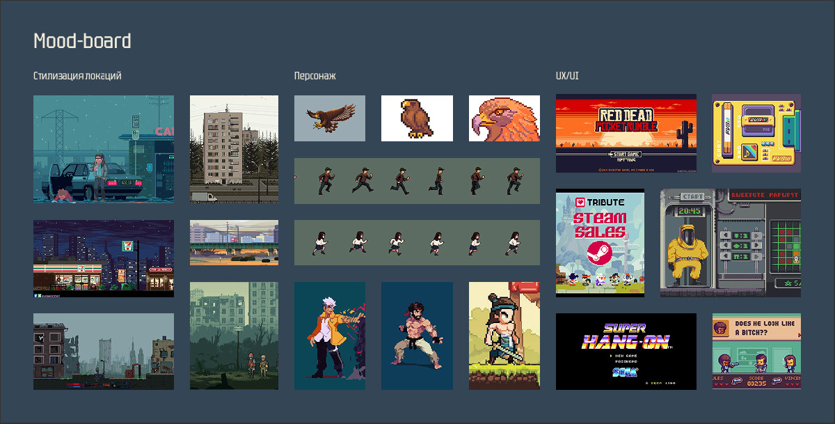 Мы создали игру-раннер с узнаваемыми локациями Омска. Основой визуала был выбран стиль пиксель-арт. Это было осознанное решение, направленное на ностальгию у взрослой части аудитории, вызывающее ассоциации с классическими 8-битными играми их детства. Клиенту был представлен мудборд с референсами