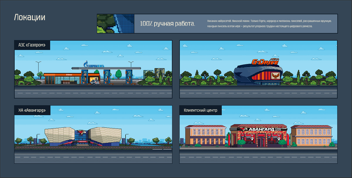 Визуальная часть – сердце этого проекта. Мы отказались от генерации графики, каждая из 5 локаций была отрисована вручную цифровым художником. Мы выбрали узнаваемые места Омска, связанные с клубом и его спонсором: стадион «Авангард», G-Drive Арену, заправки «Газпромнефть». Это создавало у игроков из Омска эффект узнавания и погружения в родной город, а у иногородних болельщиков — ощущение причастности.