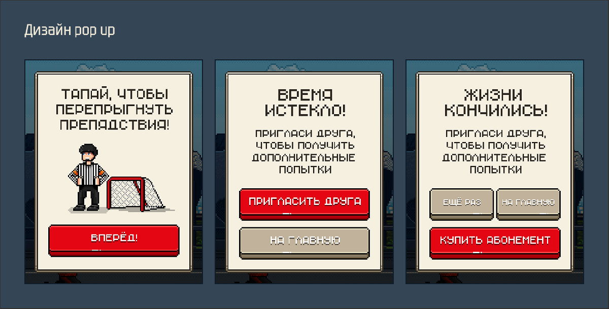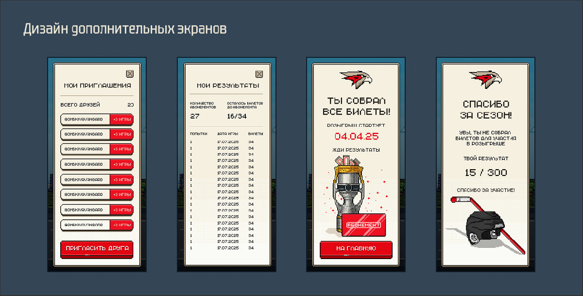 На старте проекта мы погрузились в специфику хоккейного комьюнити. Фанаты «Авангарда» – это лояльная, эмоциональная аудитория, скучающая по хоккею в межсезонье. Мы предложили несколько идей, и клиент остановился на классической, но проверенной механике раннера. Это позволяло быстро погрузить пользователя в игру без долгого обучения и давало простор для визуального творчества. Чтобы игра сработала, она должна была быть не просто развлечением, а частью мира болельщика. Мы встроили в механику главный приз – 10 реальных абонементов на матчи, а сбор виртуальных билетов и абонементов в игре стал прямым путём к его получению.