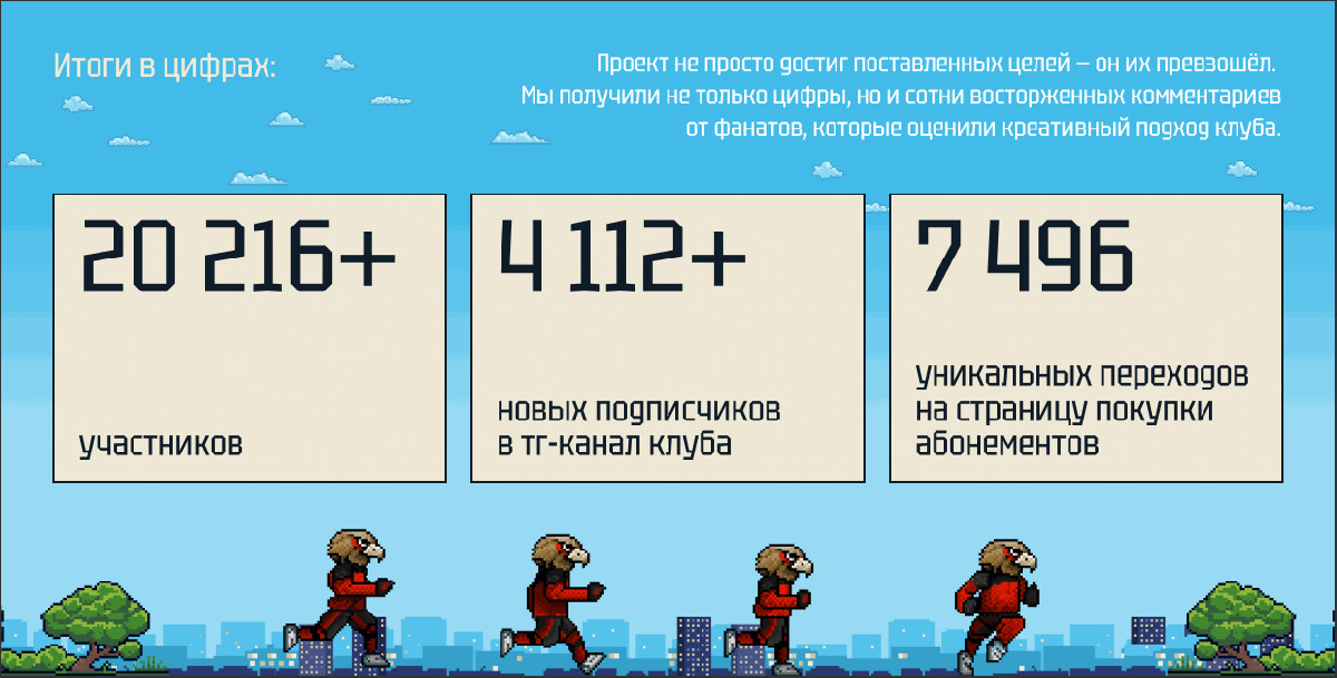 Суммарное время, проведённое в игре, составило 1625 часов. Проект получил сотни позитивных отзывов и подтвердил эффективность геймификации как инструмента для решения маркетинговых задач в спорте.