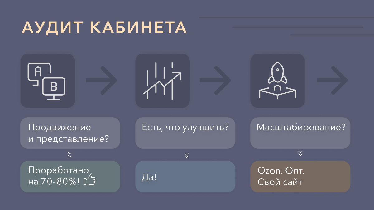 В процессе презентации аудита мы провели консалтинг и по комплексному развитию бизнеса, не органичиваясь маркетплейсами. Посоветовали настроить аналитику на собственном сайте и подключать инструменты продвижения как на розницу, так и на опт.