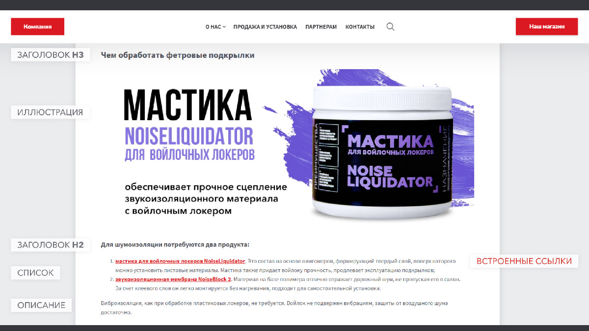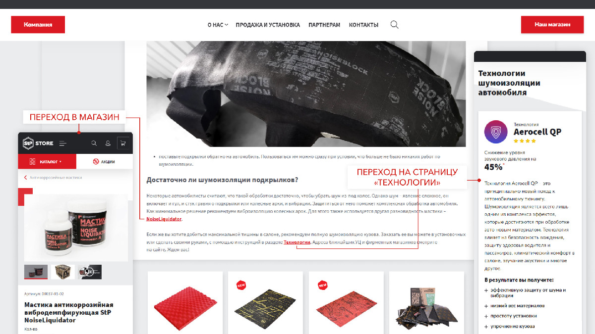 У компании был блог, но мы решили его усилить и целенаправленно оптимизировать под SEO, а также укрепить связь с каталогом — перенаправлять информационный трафик в коммерческий. Сайт — корпоративный. Он знакомит покупателей с продукцией компании, но при этом есть интернет-магазин, в котором можно заказать подходящую шумоизоляцию. Вот туда-то мы и решили перенаправить интерес.