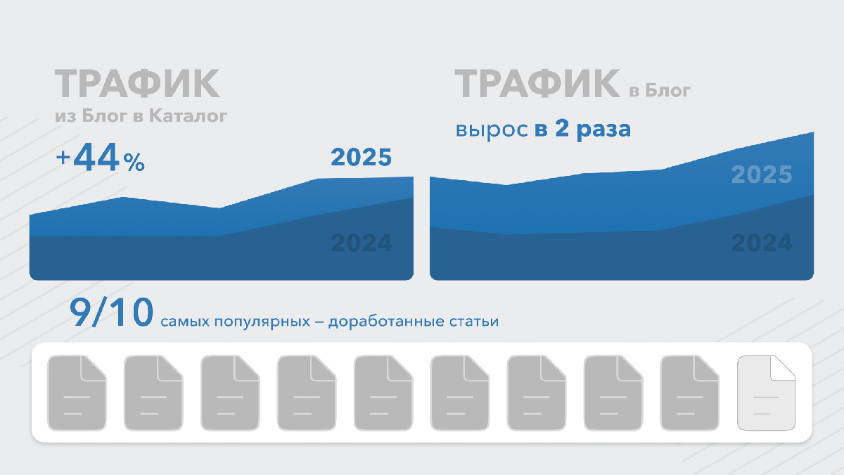 Мы усилили корпоративный блог производителя шумоизоляции с помощью информационного SEO: обновили статьи, создали новые материалы, выстроили перелинковку и медиа. В результате трафик вырос вдвое, а переходы в каталог — на 44%.
