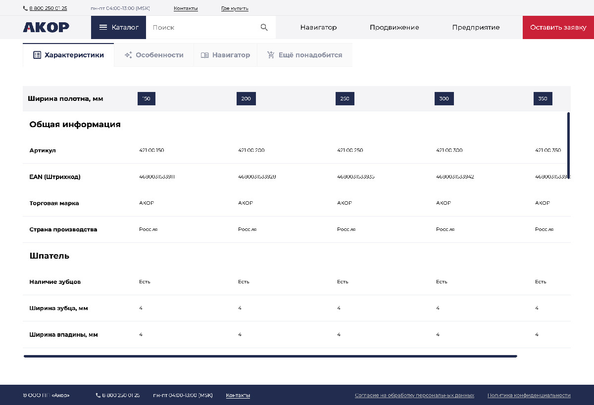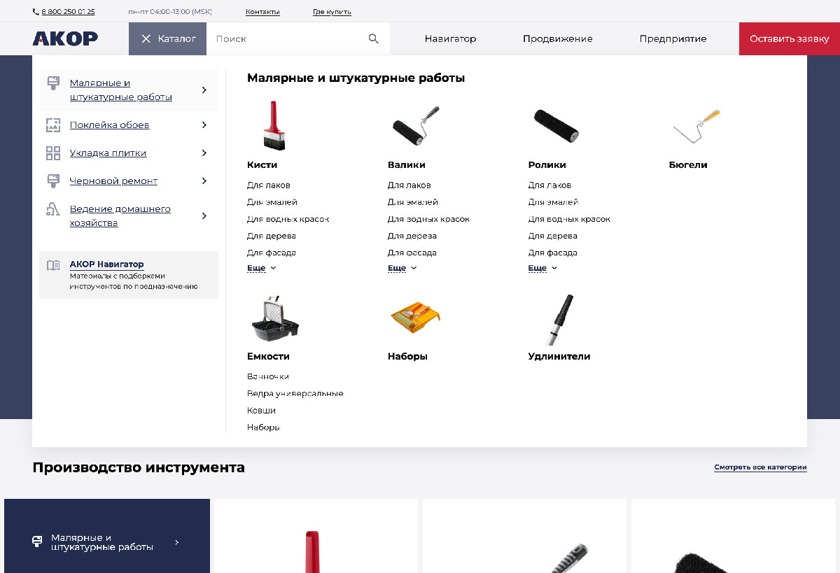 Главным запросом клиента было создать эффективный сайт-каталог для B2B-продаж, который бы наглядно показывал все преимущества продукции бренда «АКОР» и позволял пользователям легко ориентироваться в товарном разнообразии.