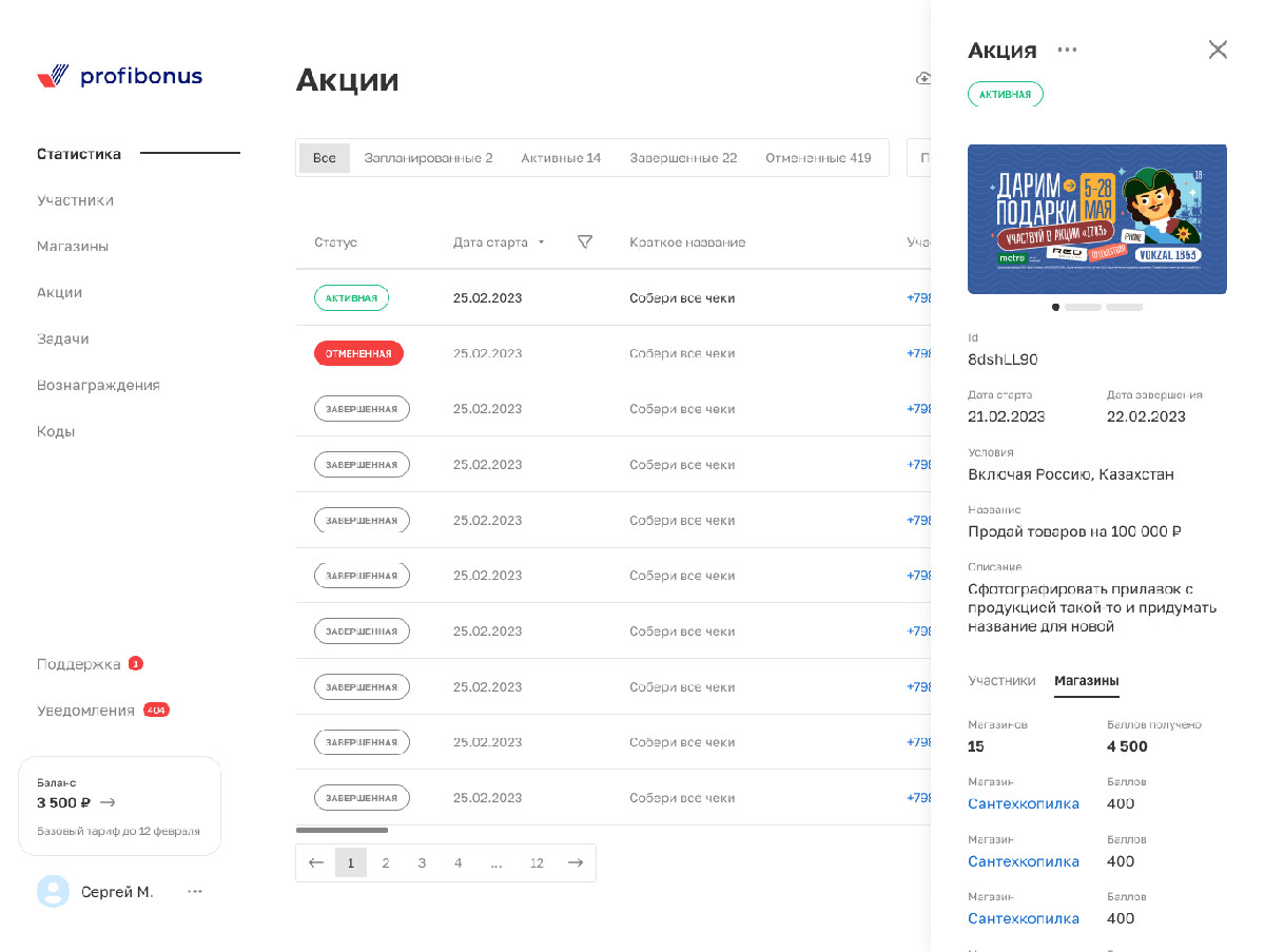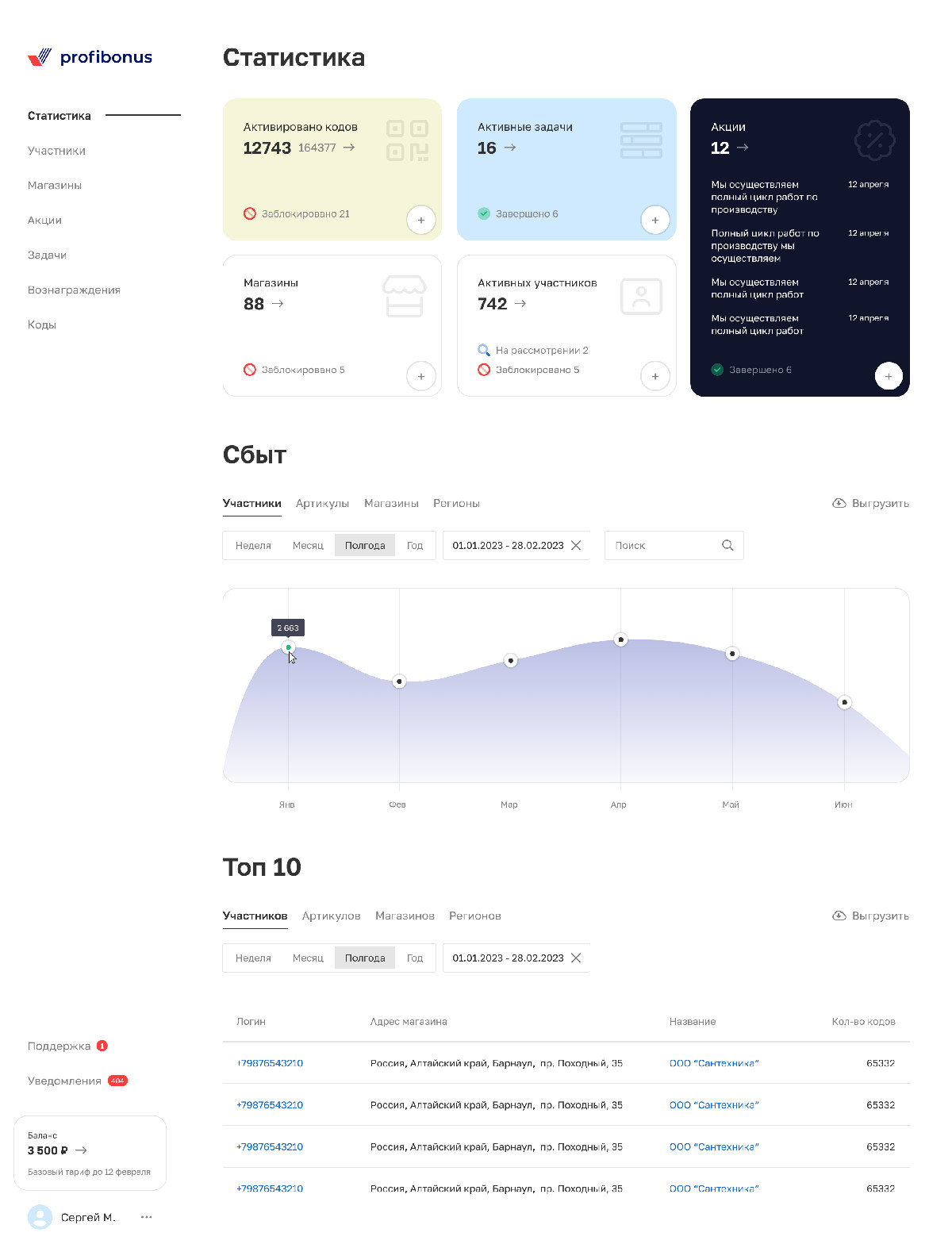 - Просмотр статистики по участникам, магазинам, кодам и т.д.