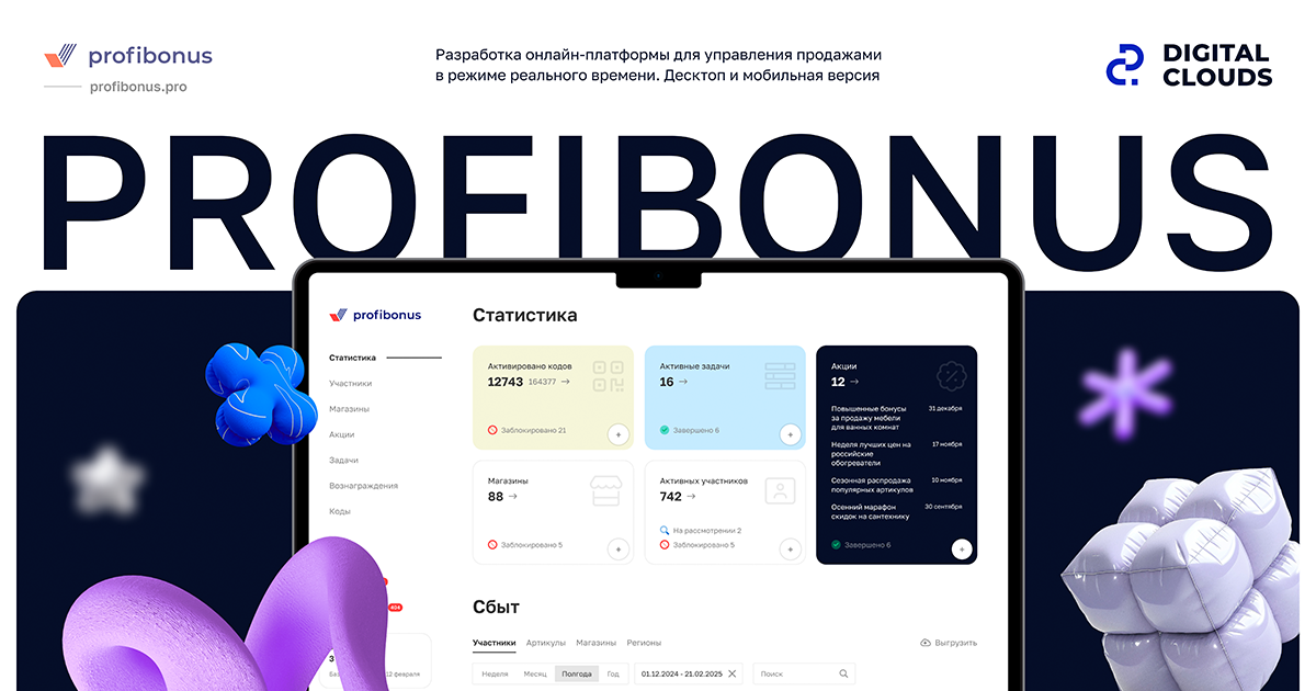 В 2023 году клиент обратился в Digital Clouds для разработки онлайн-платформы Profibonus — системы управления продажами с подключением вендоров и гибкой настройкой функционала. У клиента уже был готовый дизайн и видение бизнес-процессов, требовавшие адаптации.