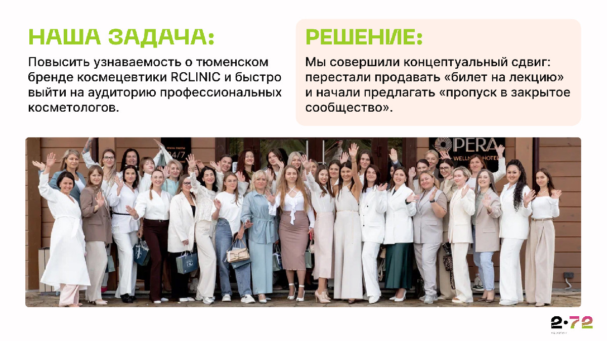 Сможем ли мы собрать 60 косметологов на платное мероприятие в мире, переполненном бесплатными вебинарами? Перед нами стояла амбициозная задача: повысить узнаваемость о тюменском бренде космецевтики RCLINIC и быстро выйти на аудиторию профессиональных косметологов.