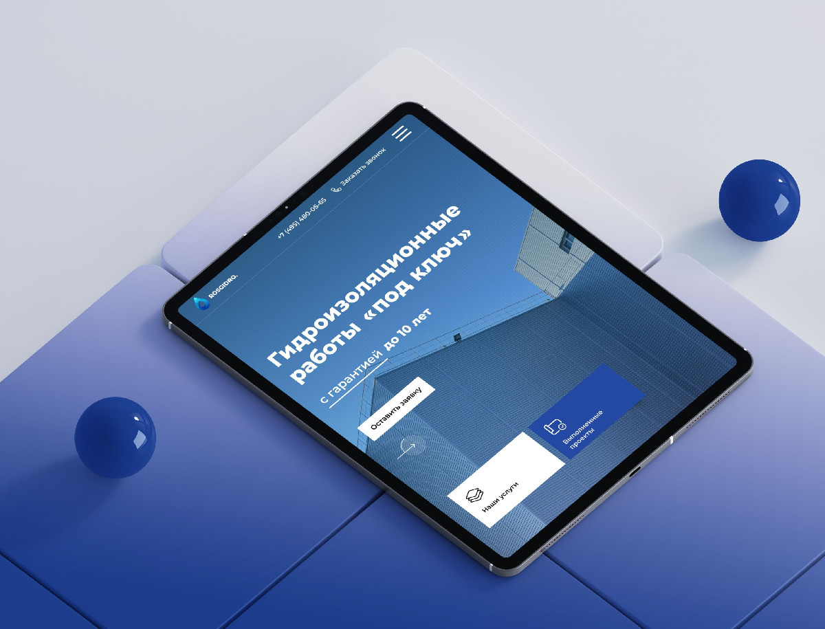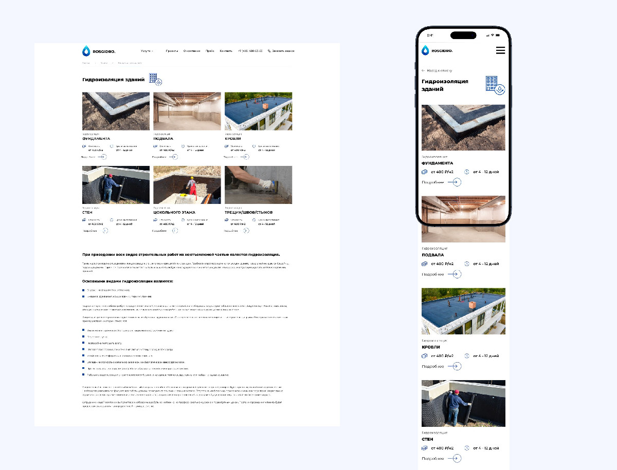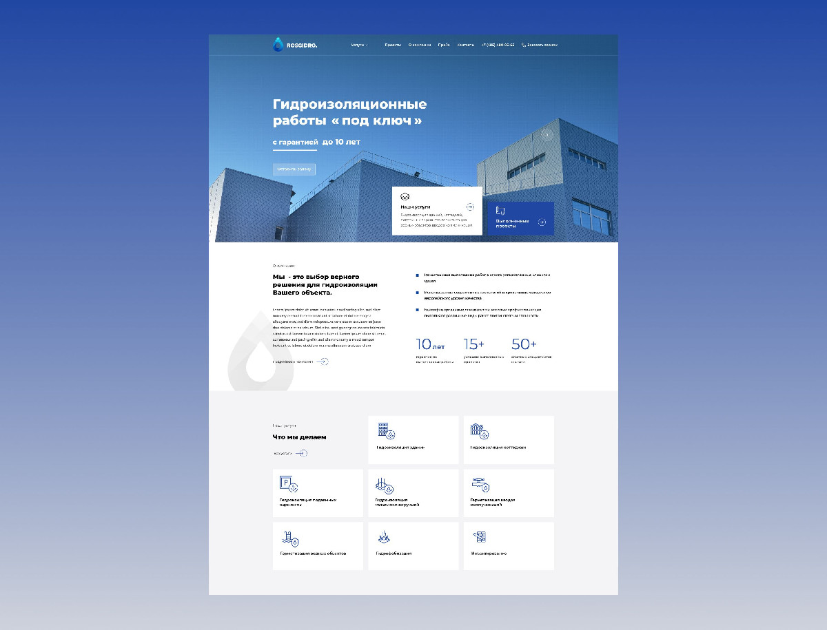 Разработать корпоративный сайт для компании «RosHydro», специализирующейся на гидроизоляционных работах «под ключ». Сайт должен был представить полный спектр услуг компании, продемонстрировать её expertise, используемые материалы и технологии, а также обеспечить удобство взаимодействия с клиентами.