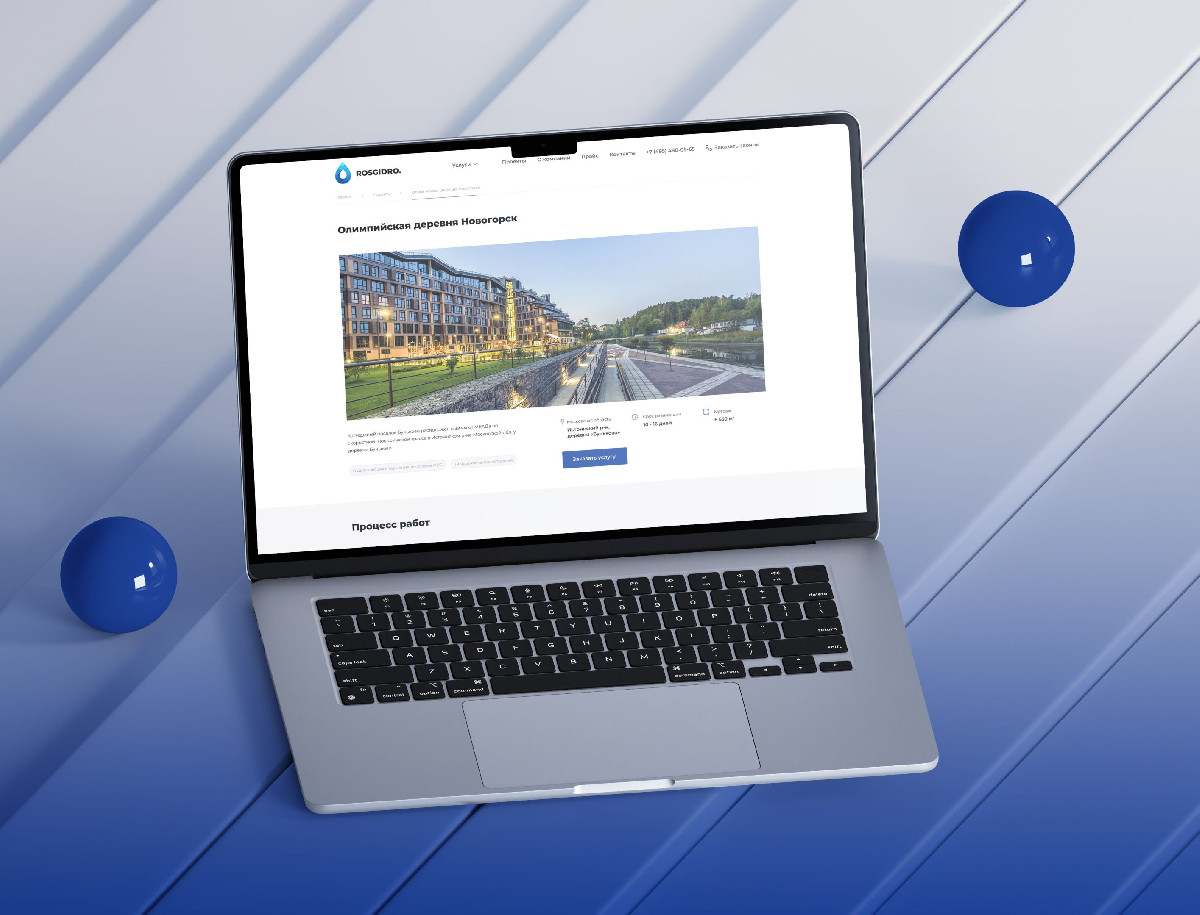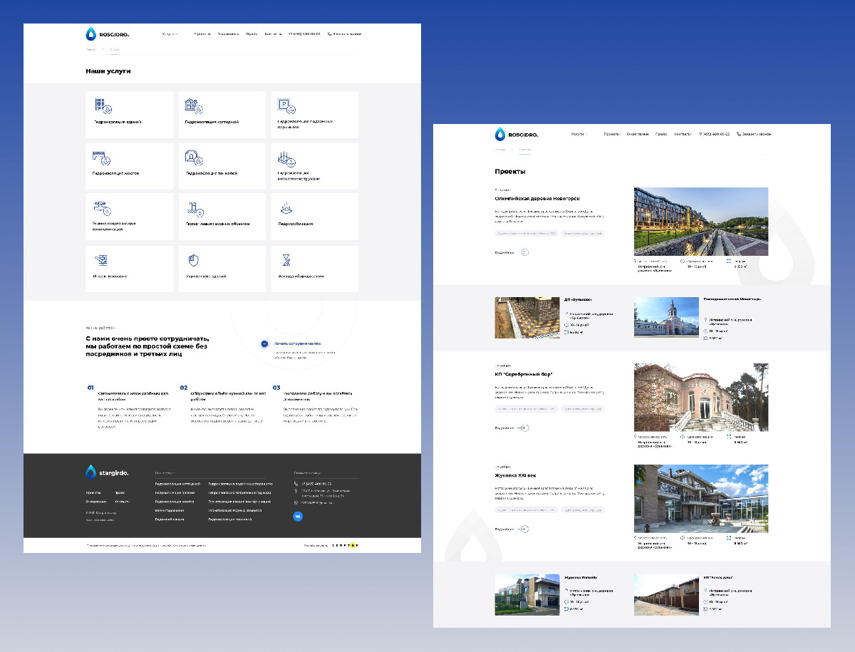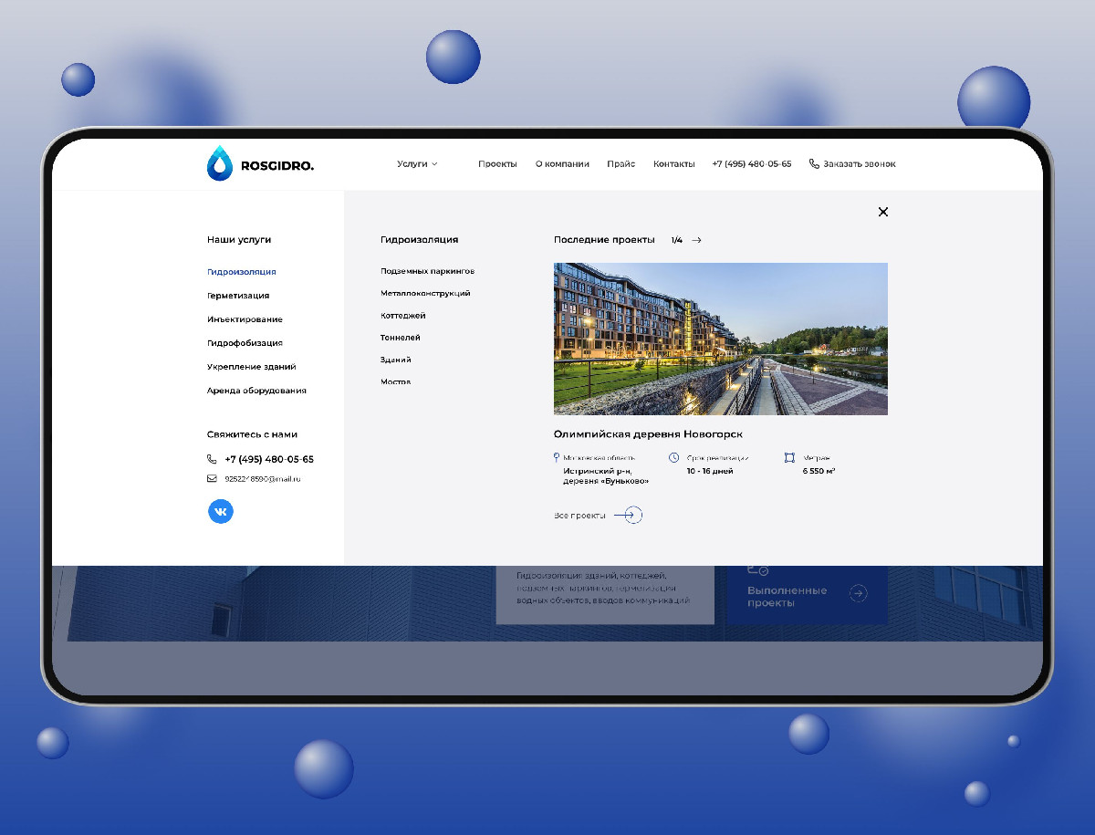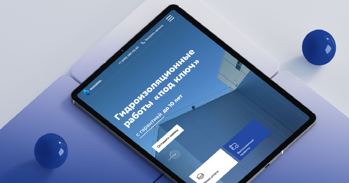 Разработать корпоративный сайт для компании «RosHydro», специализирующейся на гидроизоляционных работах «под ключ». Сайт должен был представить полный спектр услуг компании, продемонстрировать её expertise, используемые материалы и технологии, а также обеспечить удобство взаимодействия с клиентами.