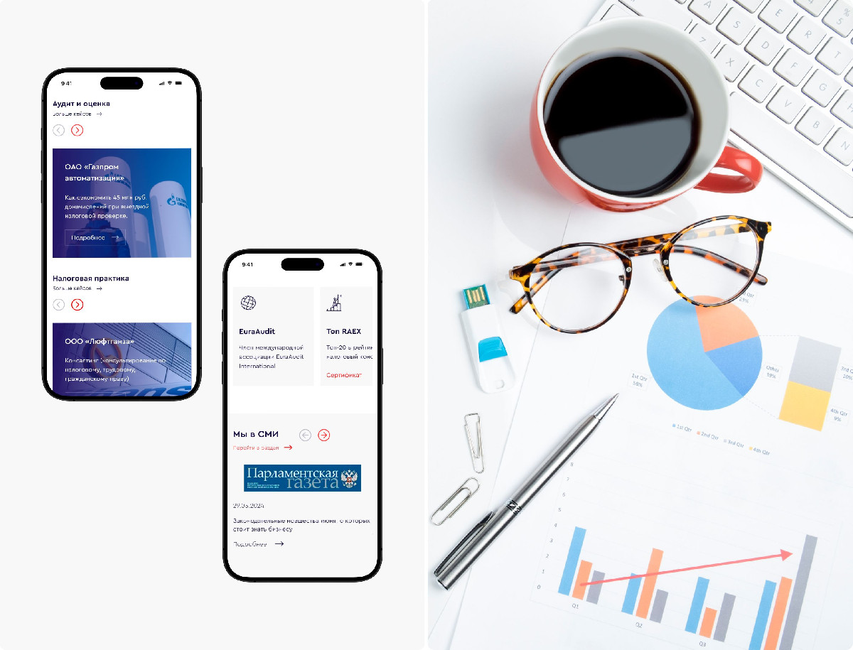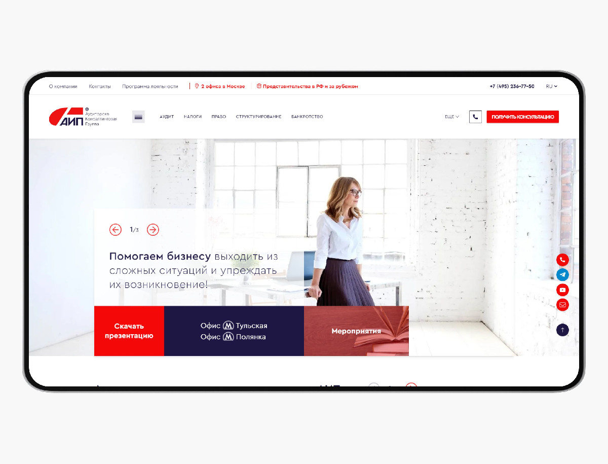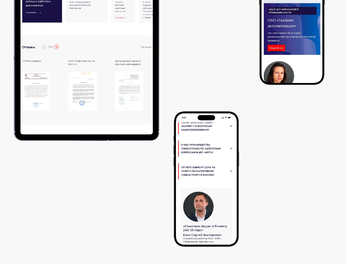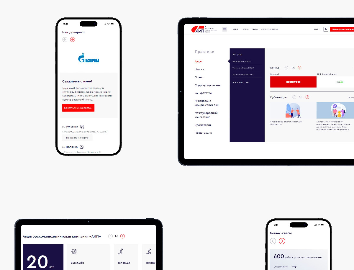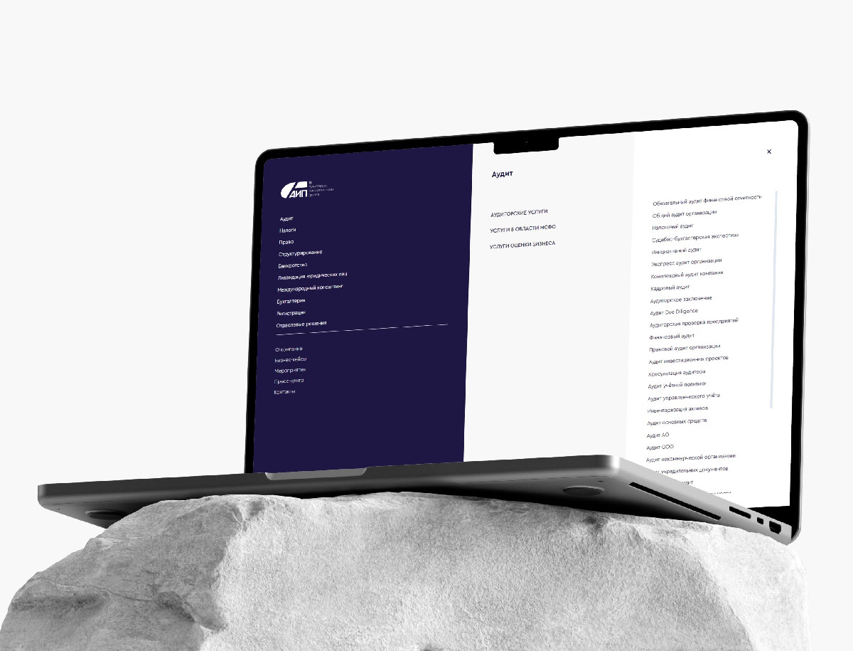 Разработка корпоративного сайта для аудиторско-консалтинговой группы «Аудит и право», одной из ведущих компаний России в области аудита, налоговых и юридических услуг. Основная цель — создать представительный и современный ресурс с продуманной структурой, который бы упрощал навигацию по сложной юридической информации, делая её доступной для восприятия.