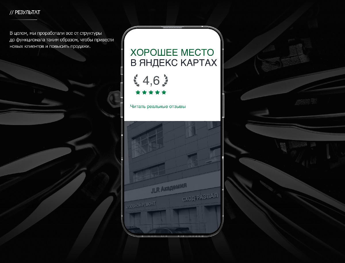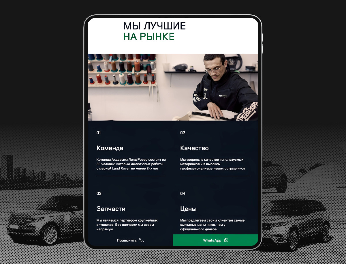 Лендинг-страница для сервиса по ремонту Land Rover стала эффективным инструментом для привлечения клиентов. Лаконичный дизайн, понятный контент и удобная форма заявки повысили конверсию и упростили взаимодействие с пользователями. Сайт способствовал увеличению числа заявок и укреплению имиджа сервиса как профессионального и надежного партнёра для владельцев Land Rover.
