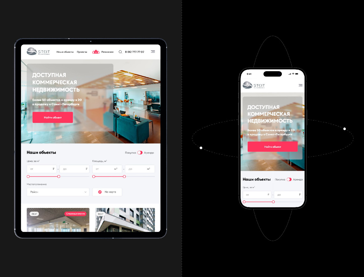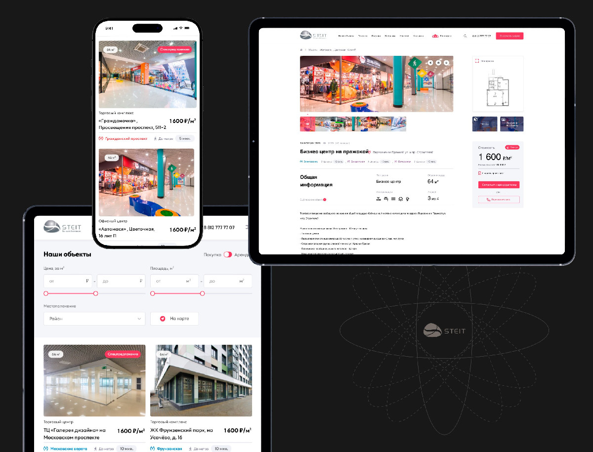 Дизайн сервиса «Steit» стал современным, удобным и визуально привлекательным. Пользователи получили возможность легко и быстро находить подходящую недвижимость благодаря интуитивной навигации и фильтрам. Визуальные элементы и анимации сделали взаимодействие с сервисом приятным и запоминающимся, что повысило лояльность аудитории и конверсию.