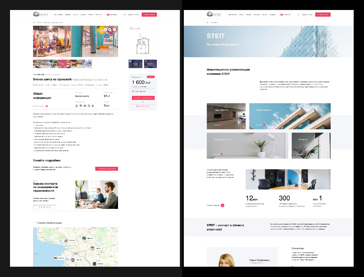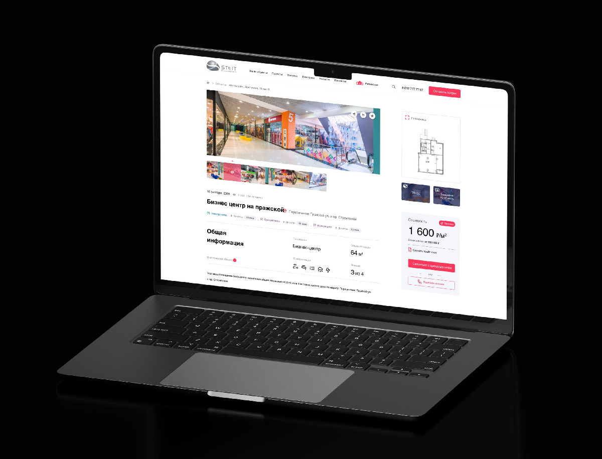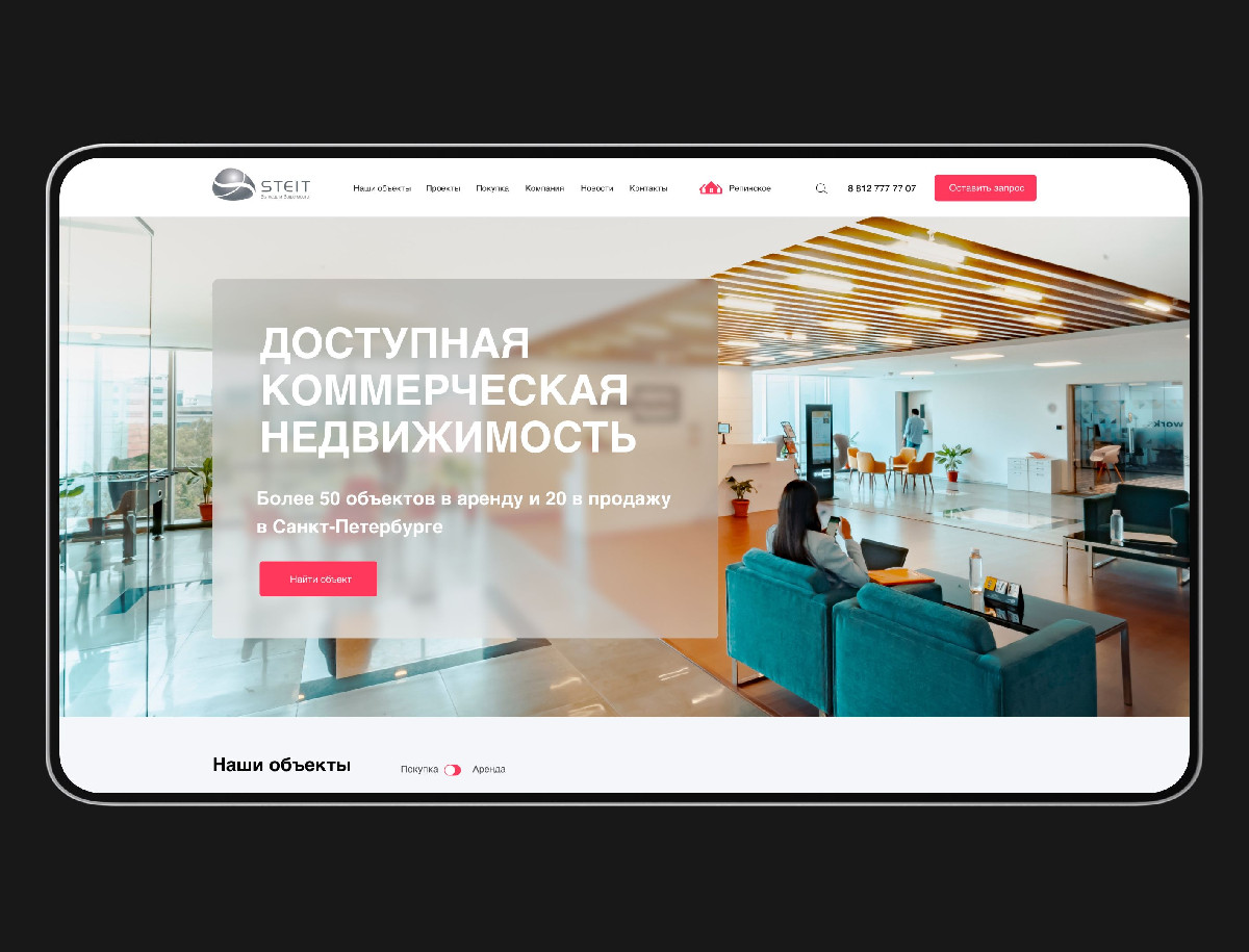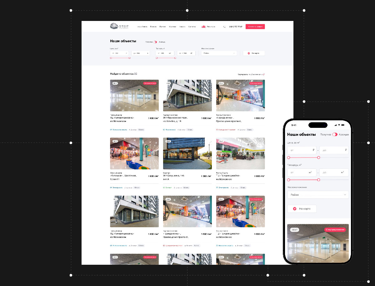 Разработан дизайн сайта каталога для агентства коммерческой недвижимости Steit с фокусом на удобное отображение объектов аренды и продажи на интерактивной карте. Сайт выполнен в современном стиле, обеспечивает интуитивную навигацию, быстрый поиск и визуальное представление объектов.