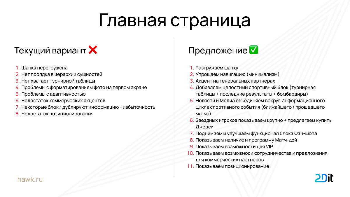 Мы начали с конкурентного анализа всех клубов КХЛ и даже вышли за пределы хоккея — смотрели на сайты крупных спортивных брендов, медиа и entertainment-проектов.