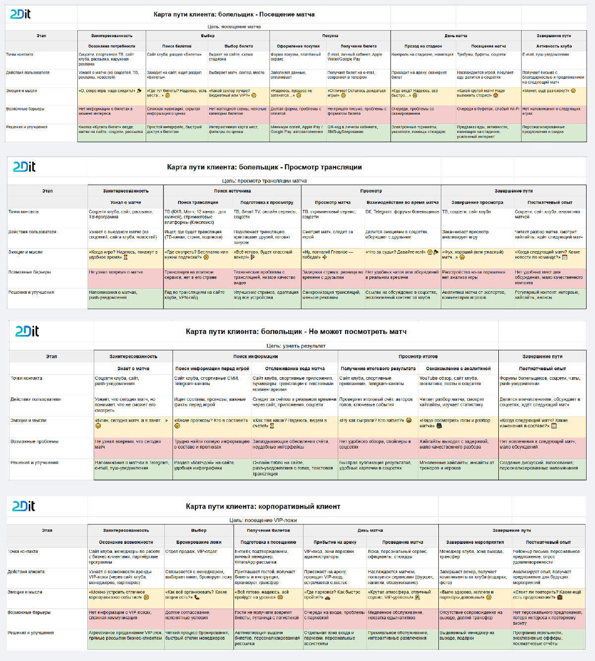 Для каждого сценария была составлена отдельная таблица, где выделены возможные точки контакта, действия пользователя, эмоции и мысли, возможные барьеры и предлагаются улучшения.
