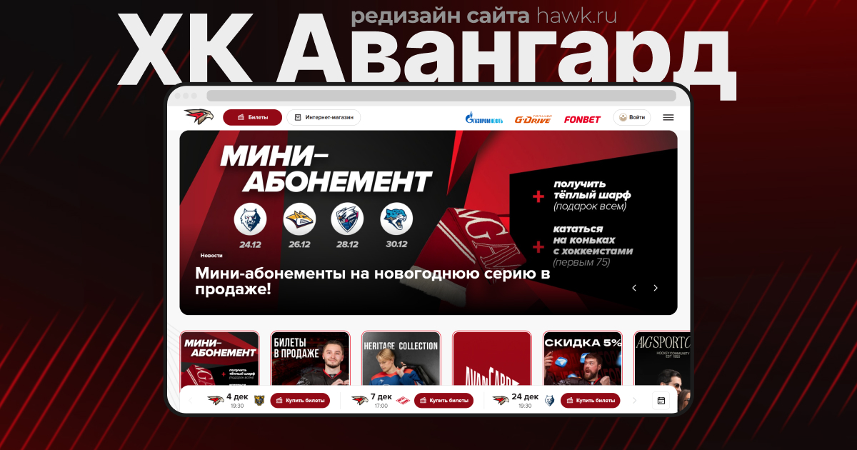 Обновили дизайн сайта ХК «Авангард», не менявшийся 7 лет: провели аудит, проанализировали метрики и пользовательские сценарии, переработали UX/UI, сохранив фирменный стиль, и запустили современный адаптивный ресурс.