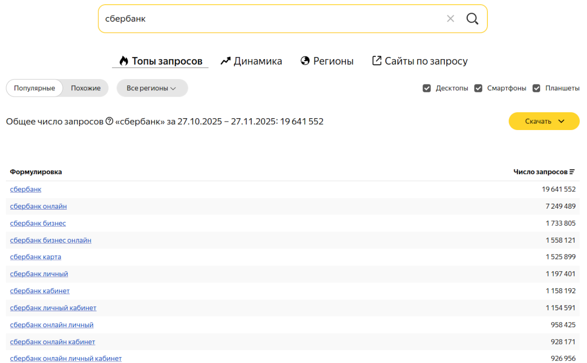 Статистика обращений по конкретным фразам называется «частотность запроса». Данные можно анализировать в разных срезах: по регионам, по месяцам/неделям/дням, по типам устройств (desktop, mobile).