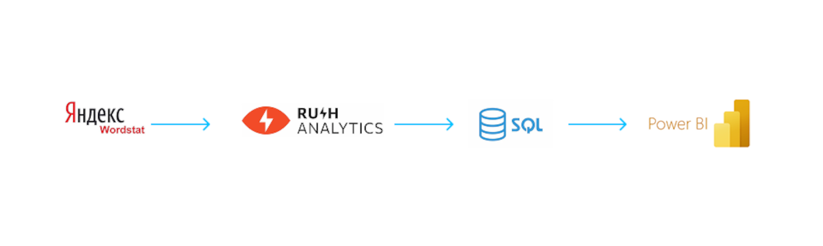 Для регулярного получения актуальной информации настроили интеграцию со сторонним сервисом Rush Analytics, который позволяет парсить данные из Wordstat по API.