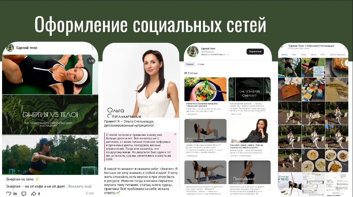 Были оптимизированы и оформлены в едином стиле профили в ключевых социальных сетях. Внедрён детальный контент-план, направленный на вовлечение через образовательные материалы, личные истории и практические рекомендации. Запущены постоянные рубрики, которые структурированно раскрывают темы питания, привычек и wellness.