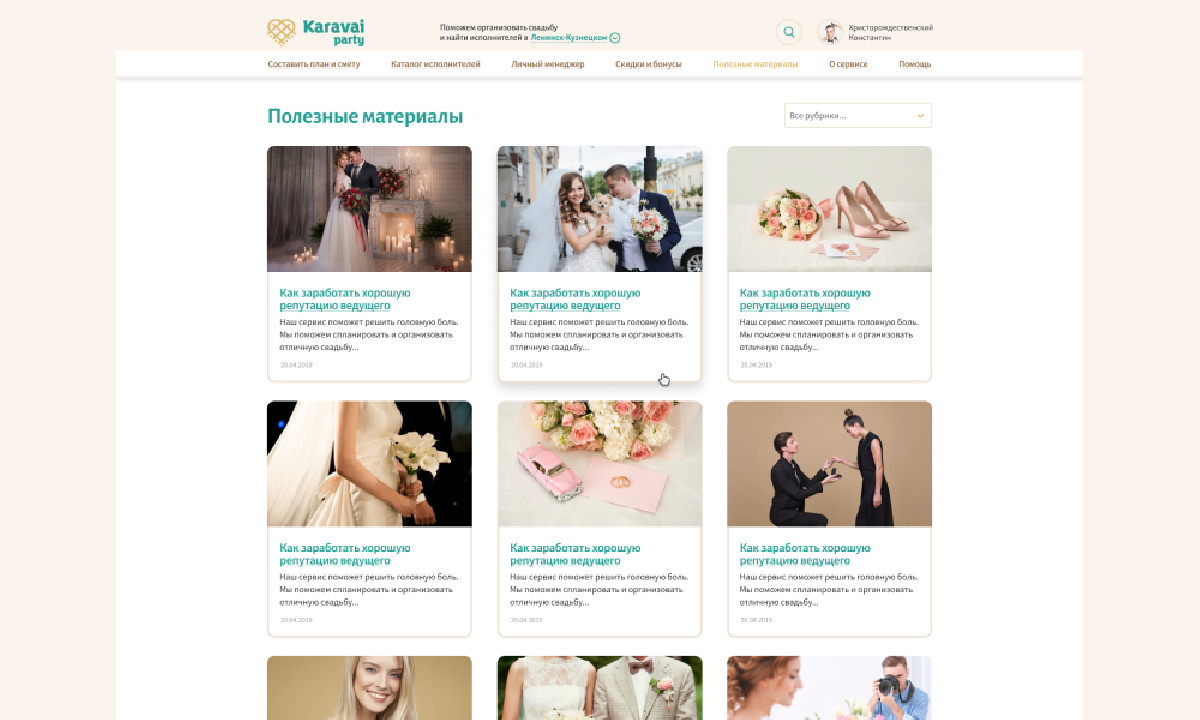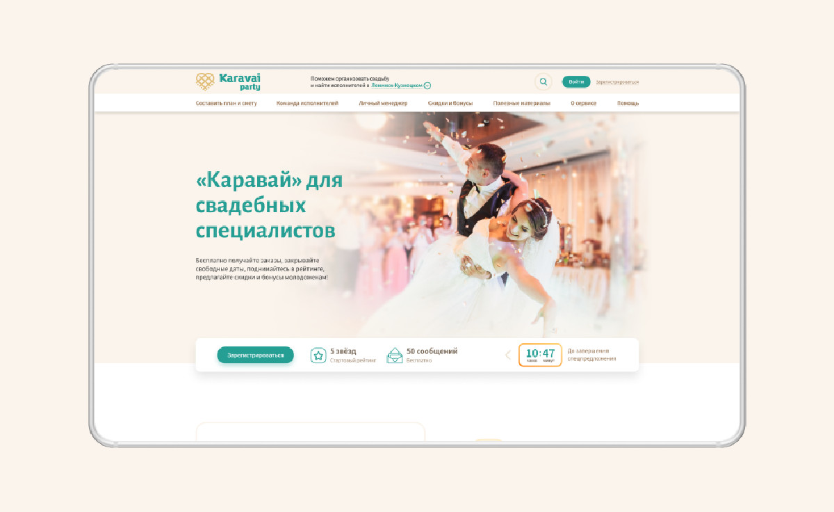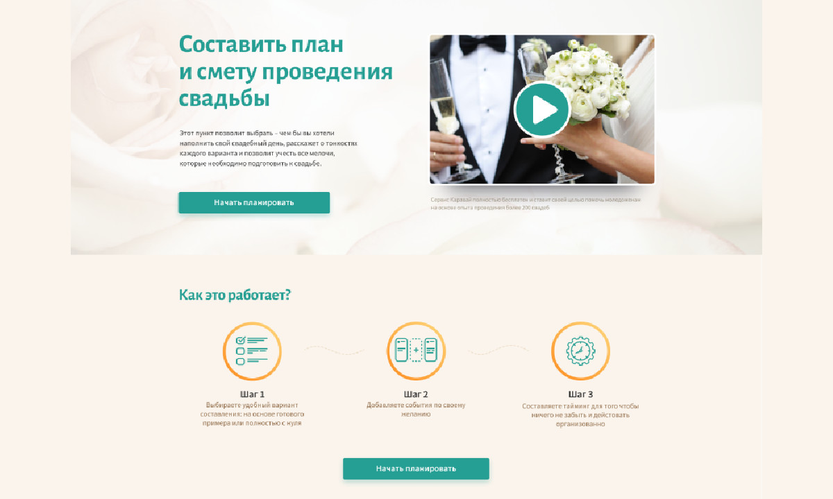 Вся информация на ней ориентирована на эту аудиторию. А дизайн разработан так, чтобы пользователь быстро сориентировался, как перейти в каталог, зарегистрироваться в качестве заказчика и попал в планировщик свадьбы.