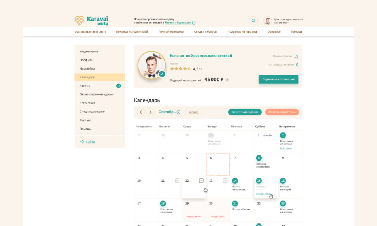 Молодожены в каталоге выбирают специалистов нужного профиля и в онлайн-режиме отправляют им заявку на конкретную дату. Исполнителю приходит уведомление с предложением. Он в личном кабинете либо подтверждает, что дата свободна и связывается с заказчиком, либо отклоняет предложение. После переговоров и согласования всех нюансов, молодожены в своем личном кабинете назначают исполнителя и заносят стоимость в план-смету.