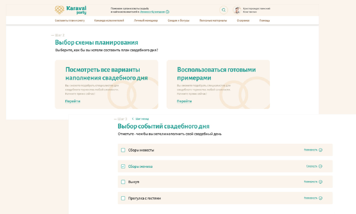 Нужно было спроектировать и разработать онлайн-конструктор свадьбы, который решал бы проблемы двух типов пользователей: