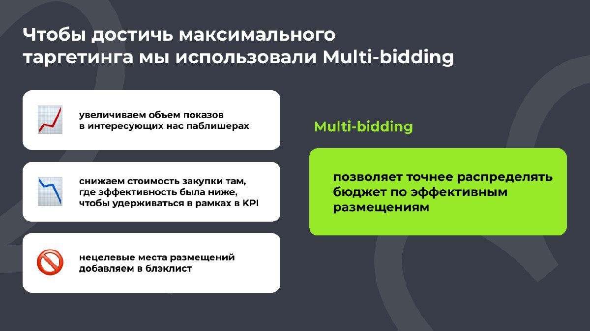 Для гибкого управления процессом использовалась настройка Multi-Bidding. Обычно в DSP задаётся единая ставка на всю кампанию, применяемая ко всем размещениям. Multi-Bidding, напротив, позволяет устанавливать отдельные ставки для конкретных площадок и SSP — повышать или снижать их в зависимости от эффективности. С помощью Multi-Bidding мы: