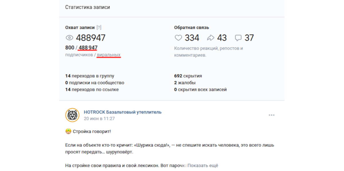 - Июнь 2025 — конкурс «Сделано в России — проверено вами» + пост-бомба 23 июня вышел «Словарь строительного сленга» — обычный полезный пост без рекламы. Результат: 1 170 000 просмотров, из них ~95 % виральные. Пост несколько дней висел в топе рекомендаций ВКонтакте.