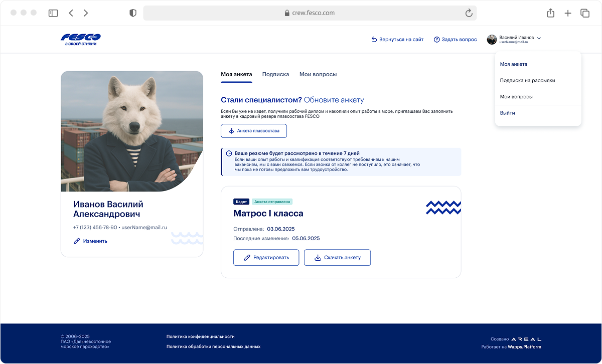 Анкету можно отредактировать, скачать, вернуться позже и подать снова, если пришел отказ. Система не ставит точку, а становится персональным пространством моряка для общения с FESCO.
