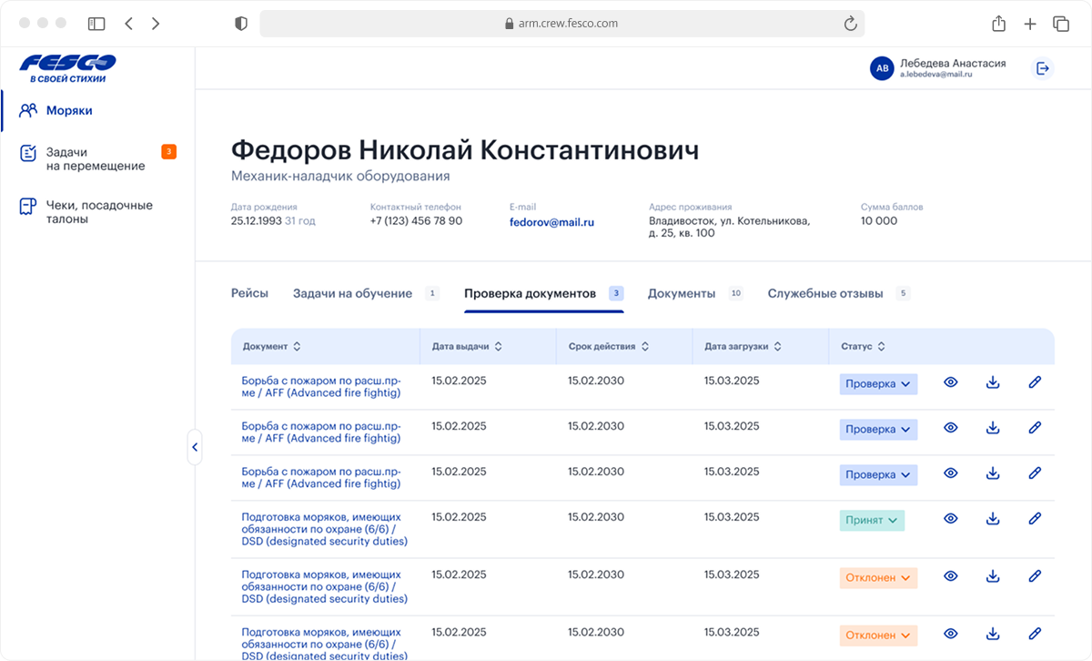 В АРМ специалист видит каждого моряка: контакты, историю рейсов, статусы, документы с датами истечения, служебные отзывы из 1С. Информация собрана в гибкую таблицу с сортировкой и фильтрацией. На детальной странице моряка добавлено разделение по типам информации, чтобы не перегружать интерфейс: рейсы, задачи на обучение, проверка документов, документы, служебные отзывы. Если FESCO предлагает моряку новый рейс, менеджер получает уведомление о его решении.
