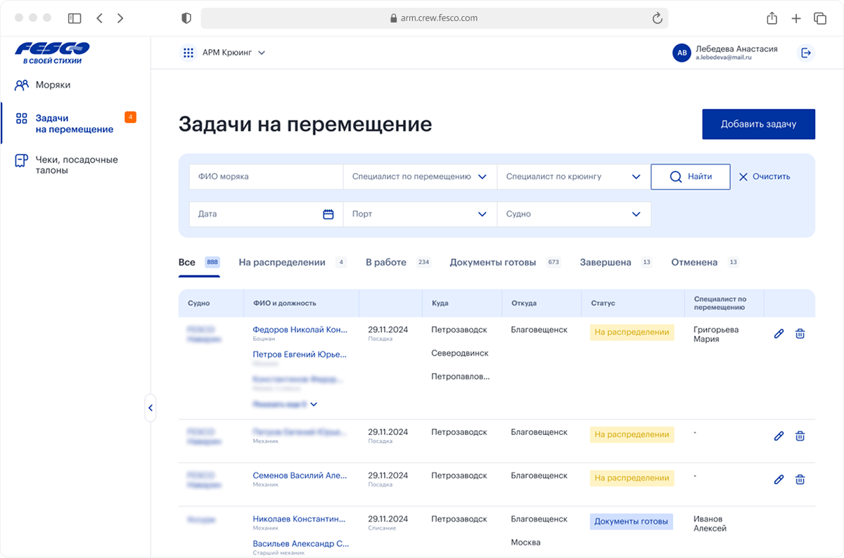 Менеджер формирует задачи специалистам по перемещению экипажей для организации доставки моряков в порт посадки, возвращения в город проживания. В задачу можно добавить как одного моряка, так и весь экипаж судна. По завершении рейса именно крюинг-менеджер изменяет статус задачи в системе.