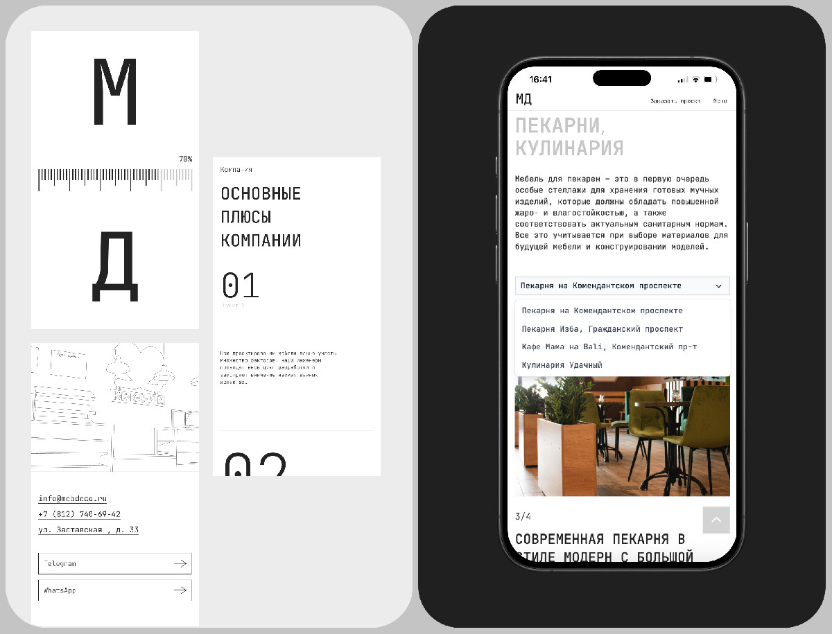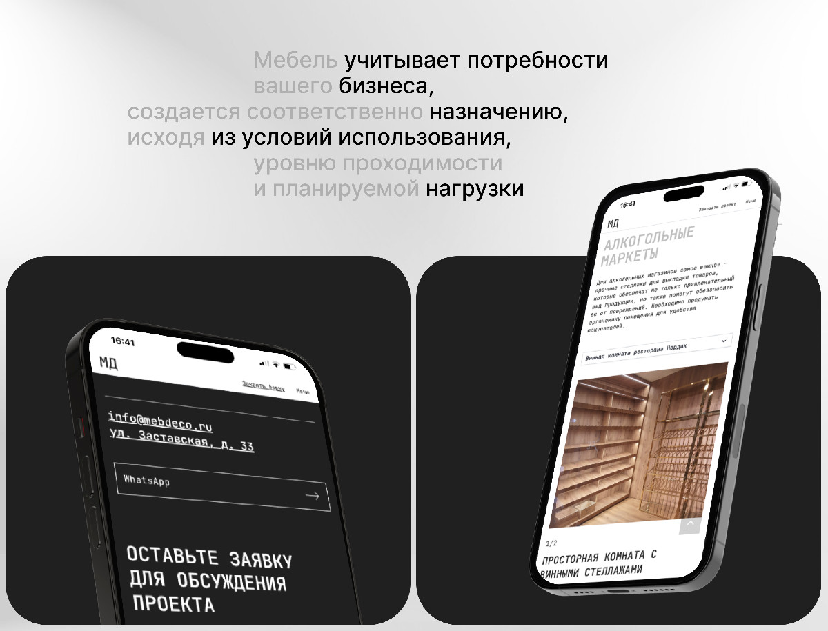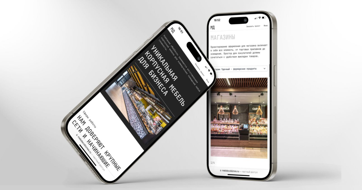 Разработанный лаконичный промо-сайт для «МебДеко» успешно решил поставленные бизнес-задачи в B2B-сегменте. Визуальная концепция, подчёркивающая эксклюзивность и качество craftsmanship, в сочетании с блоком реализованных проектов, эффективно презентует экспертизу компании. Функциональные элементы — онлайн-заявка с выбором услуги и CRM-интеграция — создали удобный и современный канал для коммуникации с клиентами. Данный подход привёл к достижению измеримых результатов: рост конверсии на 50% и увеличение времени на сайте на 25%. Таким образом, сайт стал ключевым инструментом для укрепления имиджа и увеличения количества качественных заявок.