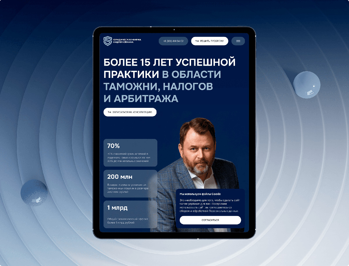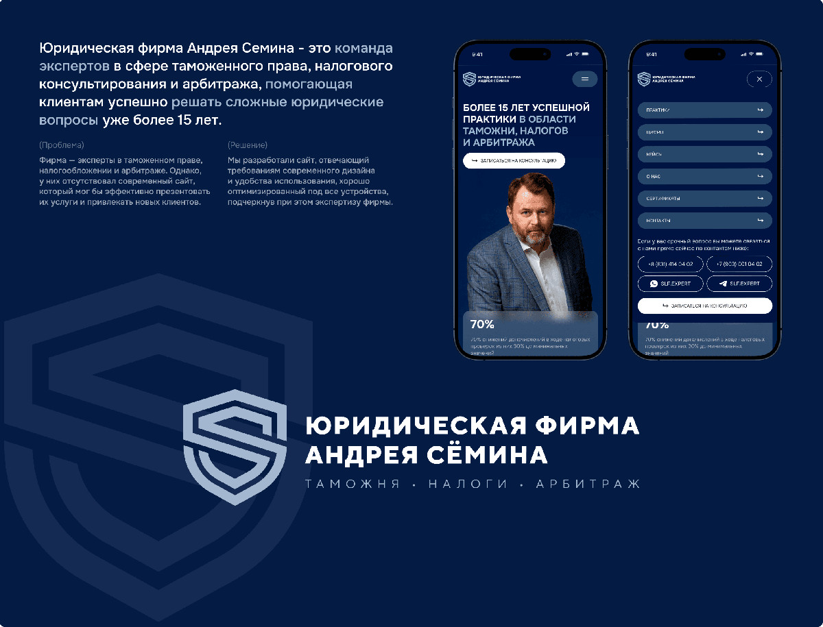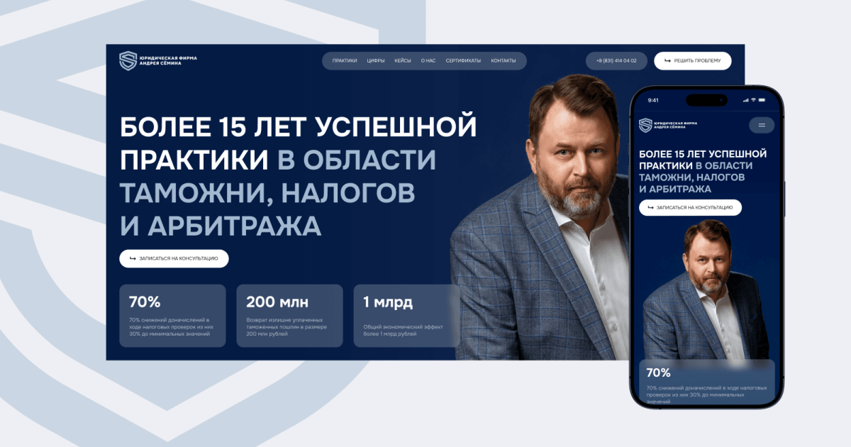 Разработать лендинг-страницу для юридической фирмы Андрея Семина, специализирующейся на таможенном праве, налоговом праве и арбитраже. Сайт должен был представить услуги фирмы, её преимущества и обеспечить удобство взаимодействия для потенциальных клиентов.