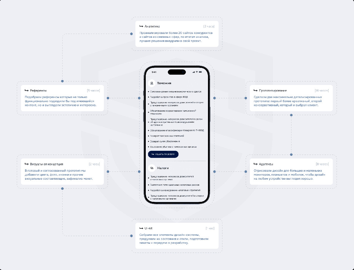 Разработан удобный интерфейс с акцентом на ключевые услуги: таможенное право, налоговое право, арбитраж.