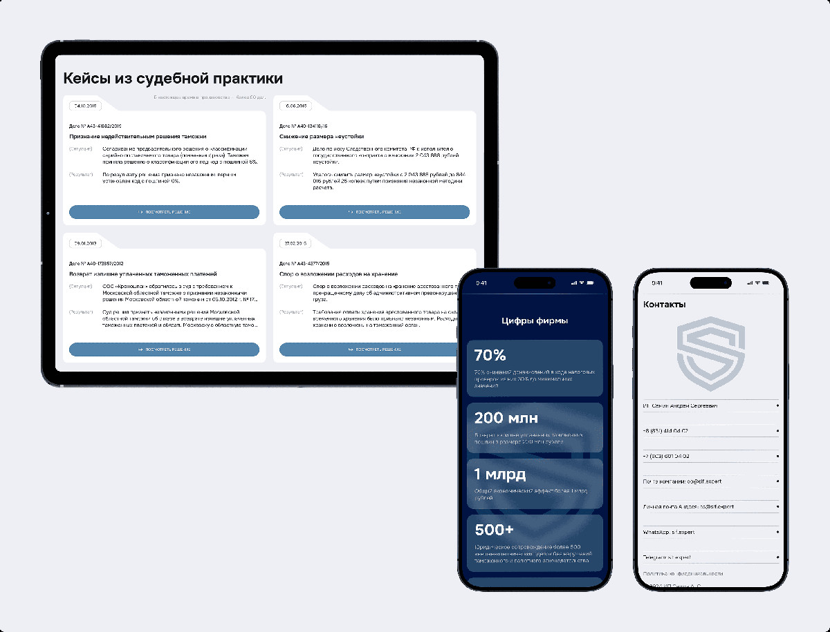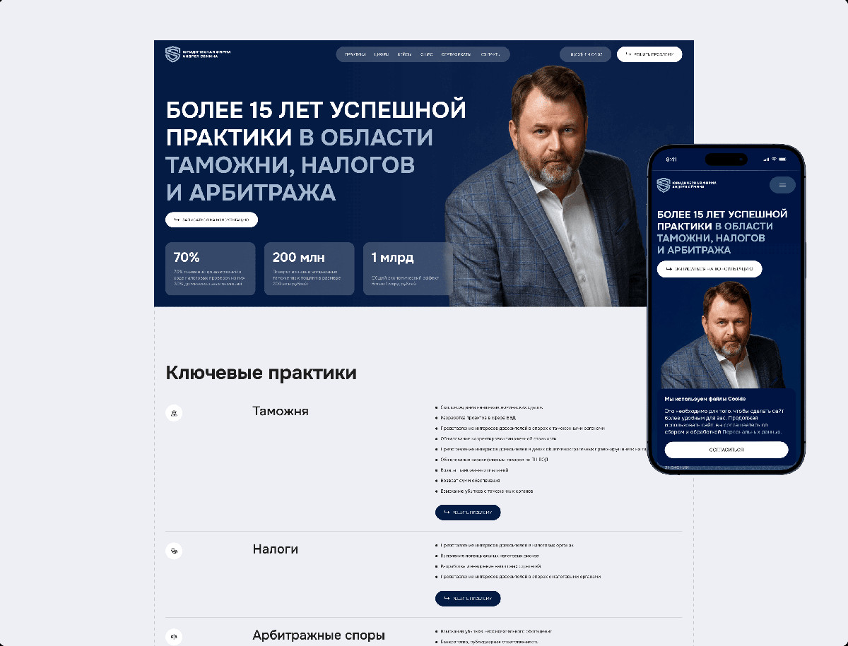 Разработанный промо-сайт для юридической фирмы Андрея Семина стал комплексным цифровым решением, эффективно выполняющим задачи по привлечению клиентов и укреплению деловой репутации. Профессиональный дизайн, чёткая структура услуг в области таможенного, налогового права и арбитража, а также ключевые блоки с кейсами и экспертизой команды создали убедительный образ надёжности. Внедрение функционала онлайн-заявок и оплаты консультаций значительно повысило удобство для клиентов. Комплексная SEO-оптимизация и адаптивность обеспечили ресурсу максимальный охват целевой аудитории. В результате сайт не только увеличил поток заявок, но и стал важным инструментом для формирования долгосрочного доверия в профессиональной среде.
