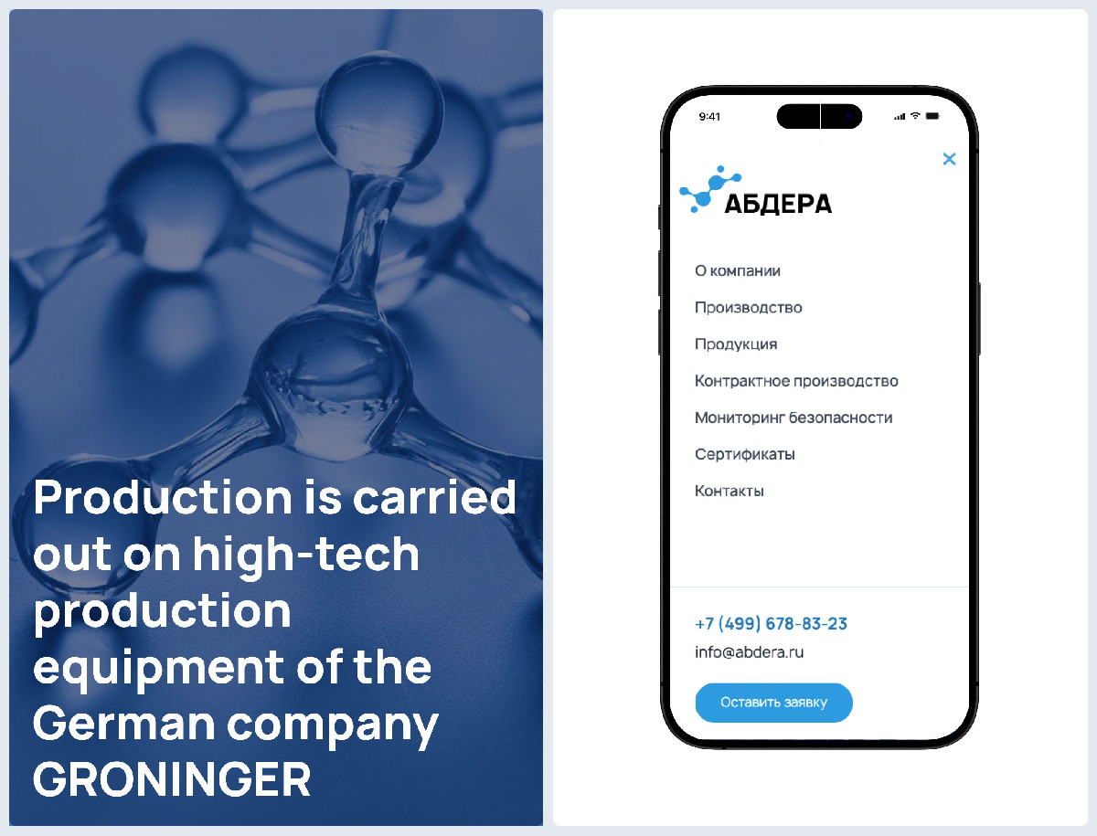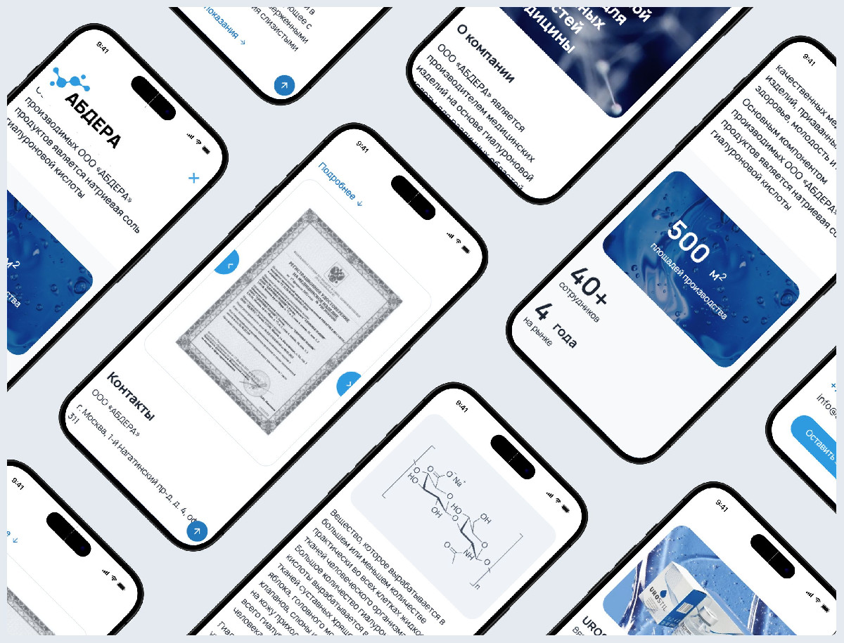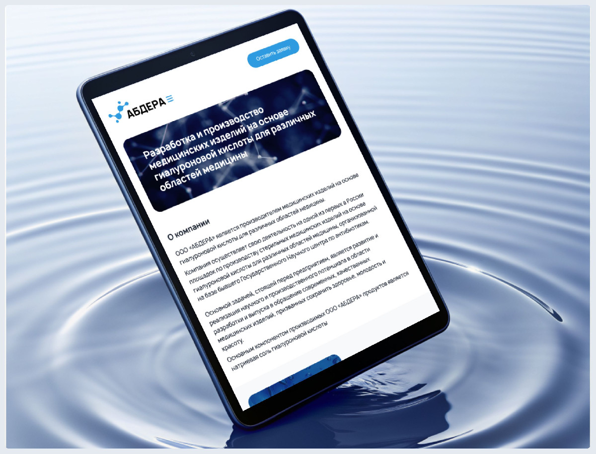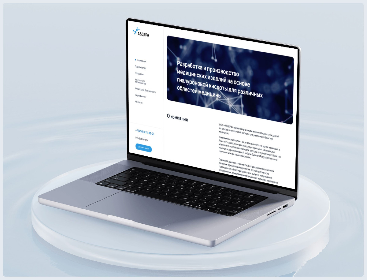Разработанный корпоративный сайт для производителя медицинских изделий «АБДЕРА» успешно решает задачи по формированию имиджа технологичного лидера и взаимодействию с профессиональной аудиторией. Лаконичный дизайн, подкреплённый научной инфографикой и качественными материалами производства, наглядно демонстрирует инновационный подход компании. Чёткая структура обеспечивает удобную презентацию продукции врачам разных специализаций, предоставляя им актуальную и структурированную информацию. В результате проект не только повысил узнаваемость бренда, но и стал эффективным цифровым инструментом для укрепления доверия среди медицинского сообщества и привлечения новых клиентов.