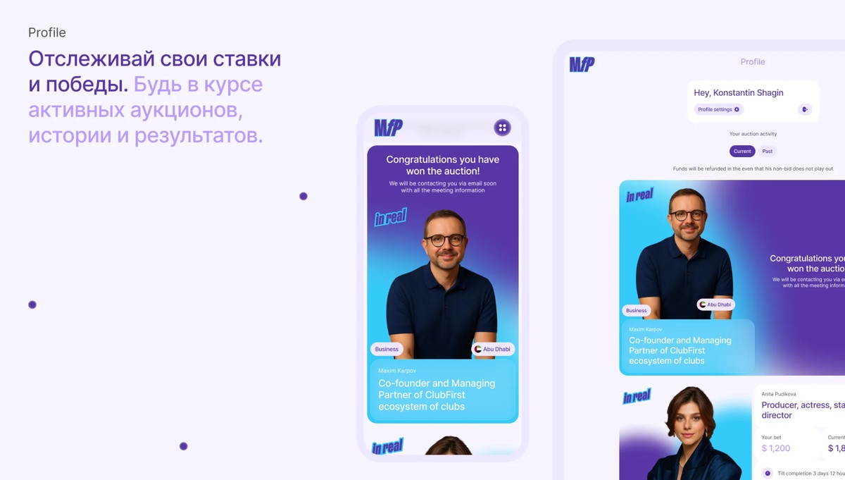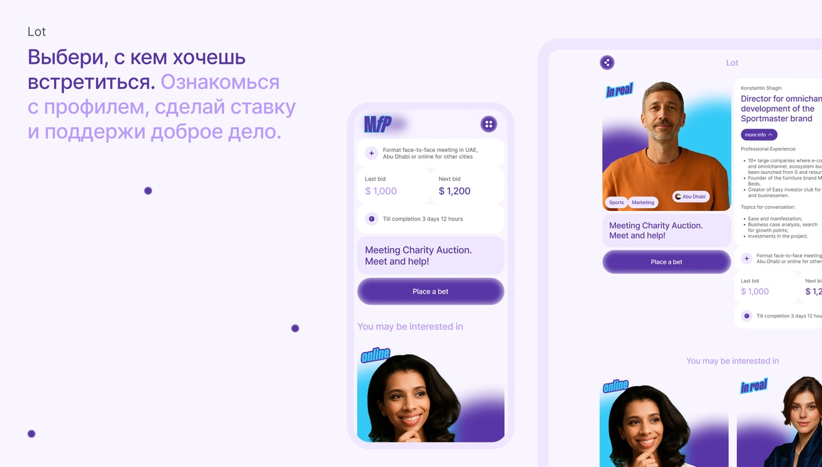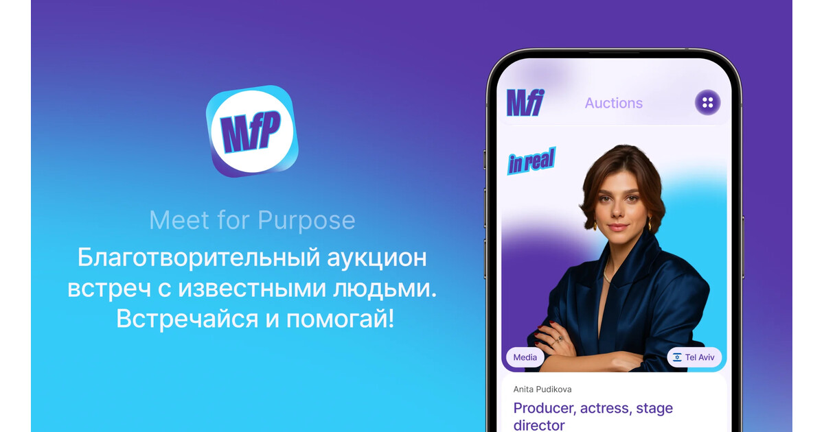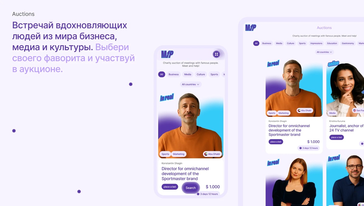 Meet for Charity — онлайн-аукцион, где за взнос на благотворительность можно встретиться с известными людьми. Компания запустила глобальную версию под брендом Meet for Purpose в Дубае и США. Для этого мы разработали мобильное приложение с возможностью масштабирования на разные страны.